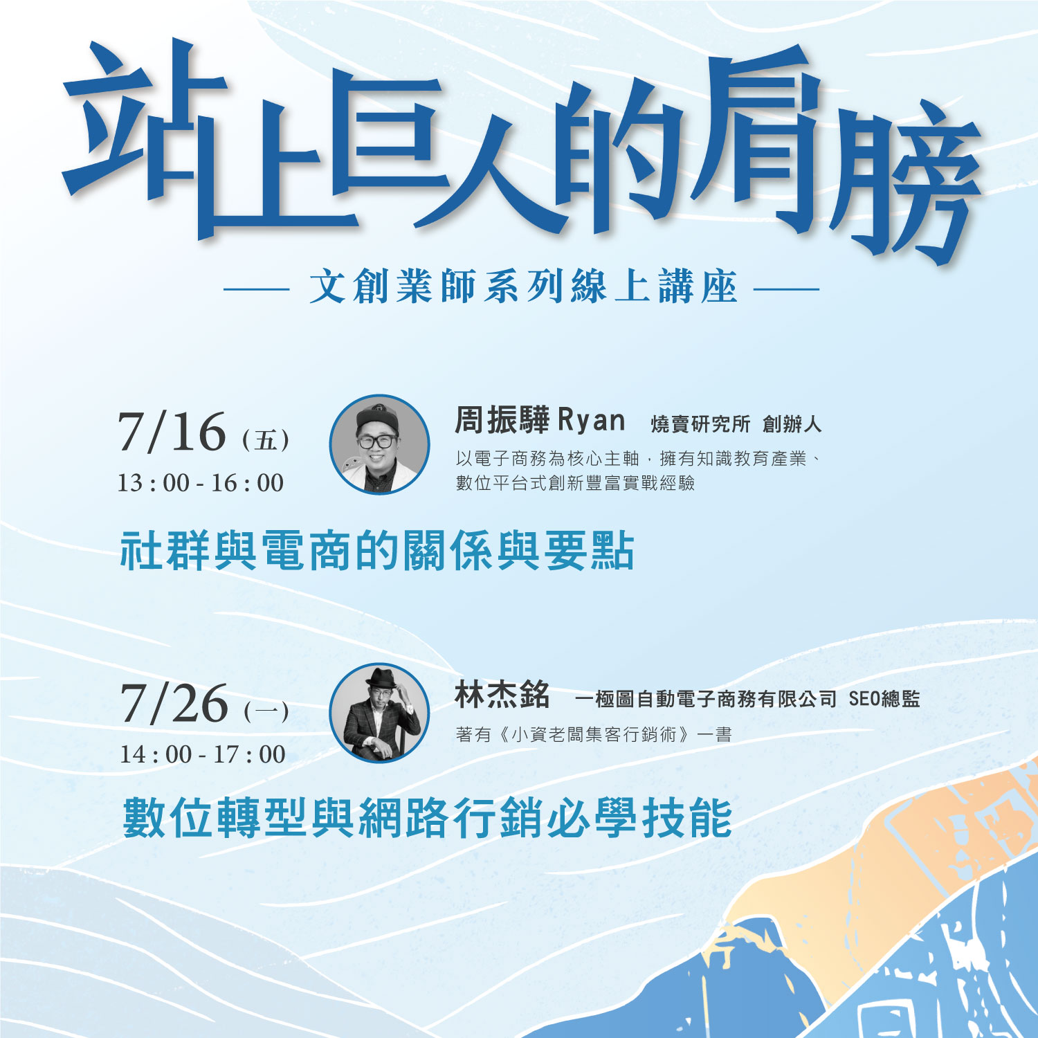 文化局說明, 716日「燒賣研究所」創辦人周振驊將分享「社群與電商的關係與要點」、726日「一極圖自動電子商務有限公司」總監林杰銘將傳授「數位轉型與網路行銷必學技能」,探討數位轉型領域中熱門的議題,包含佈局搜尋通路、網路廣告平台的比較,及如何透過搜尋引擎讓客戶上門,讓您掌握業界趨勢,創造數位經濟的商機。