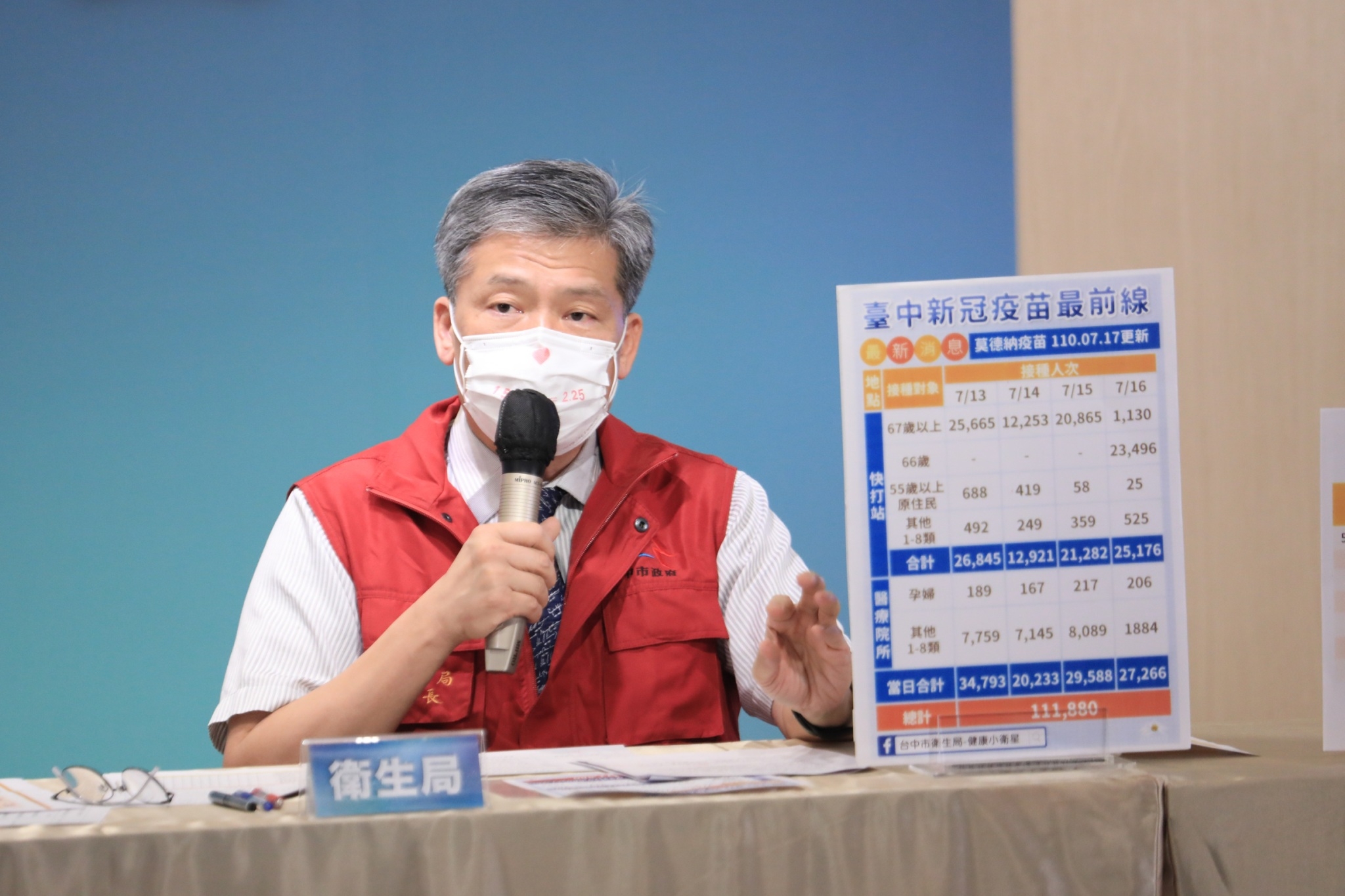 衛生局長曾梓展補充,統計至今日早上8時止,台中市AZ疫苗累計施打23萬6343人、莫德納疫苗共有27萬4341人,其中光7月13日至16日四天,台中市各區快打站加上醫療院所全面開打,高效率接種11萬1880劑;針對剩下的莫德納疫苗,將優先保留給已施打過第一劑莫德納的醫事人員及孕婦,守護辛勞的一線醫事人員與孕媽咪。(7/17*14)*衛生局