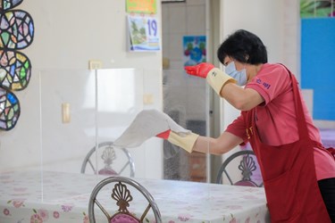 社會局指出,日照中心除了活動室和用餐空間環境清消,工作人員也為長輩的桌椅、餐具和隔板清潔消毒。疫情期間日照暫停服務,但機構照常運作,其中仁愛之家每日至少2次環境清消;工作人員與長輩分區分流活動,確保室內1.5公尺社交距離;分批用餐避免群聚,用餐區採梅花座並使用隔板;執行照顧工作時,全程佩戴口罩、著手套、防護衣、圍裙及護目鏡等防疫裝備。