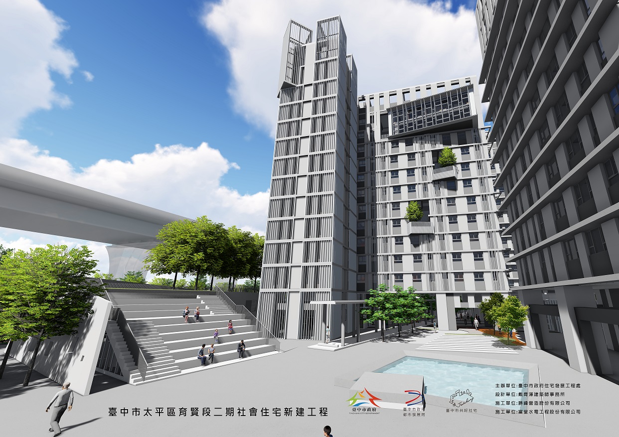 住宅處說明,太平區育賢二期好宅基地位於太平新光重劃區精華地段,緊鄰74號快速道路口,交通十分便利,也臨近學校、公園及醫院,生活機能完善。基地規劃4幢地下2層地上12層的複合混居式好宅;地面層設有店鋪26間,居住設施提供1房型(8)223戶、2房型(16)139戶及3房型(24)66戶,合計428戶優質好宅,設有共同景觀陽台、多功能活動教室及共同廚房。