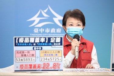 台中市截至今(20)日上午8時,接種第一劑疫苗已達53萬5,893人,對照台中18歲以上有234萬5725人,疫苗覆蓋率達22.8%;對此,市長盧秀燕表示,市府持續加速接種,今起連三天開設快打站,為「唐鳯系統」第二輪預約民眾、專案造冊的國小及學齡前教職員及65歲長者服務,截至今日中午12時30分,50處快打站合計接種2萬8,218人,覆蓋率穩定上升。