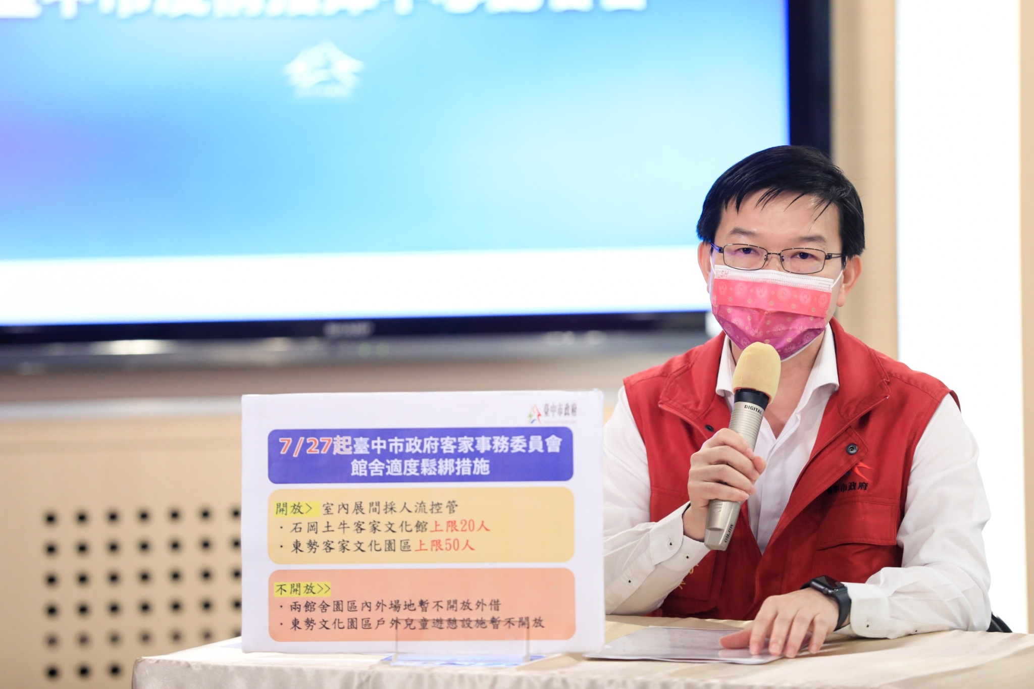 客家事務委員會主委江俊龍說明,台中市石岡土牛客家文化館及東勢客家文化園區,自7月13日起採階段性開放,適度開放園區戶外廣場空間及停車場供民眾使用;7月27日起,室內展間採人流控管,石岡土牛客家文化館各時段容留人數以20人為限,東勢客家文化園區則以50人為限,兩館舍室內外場地暫不外借,東勢客家文化園區戶外兒童遊憩設施暫不開放。(7/21*7)*文化局、客家事務委員會