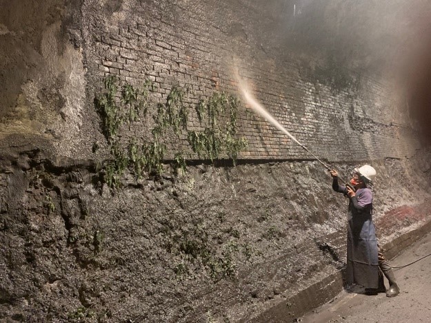 因應國內疫情趨緩、三級警戒適度鬆綁,台中市部分自行車道及登山步道等旅遊景點自7月13日起有條件解封,台中市政府觀光旅遊局積極加強各項觀光景點整備與維護,其中每年吸引遊客到訪的東豐自行車綠廊與后豐鐵馬道必經的九號隧道,更是串接兩條自行車道間重要觀光節點,九號隧道全長1.2公里,至今結構良好,惟隧道內因長年堆積的塵土及青苔嚴重覆蓋既有紅磚牆面紋路,為確保各項設施清潔維護及安全美觀,觀旅局於疫情三級警戒封閉期間進行牆面清洗及補強施工,以提供遊客更加優質安全美觀的遊憩環境。