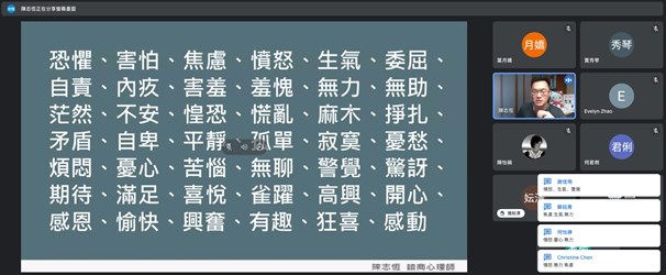 青少年的情緒起伏常讓家長頭疼,易因管教與孩子發生衝突,台中市家庭教育中心今(23)日舉辦「大人愈自在,孩子愈可愛-陪伴孩子一起做情緒的主人」線上講座,邀請到知名暢銷書《正向聚焦》作者、諮商心理師陳志恆,與家長分享陪伴青少年子女情緒風暴的教養觀念。透過具體、好懂的實例,及易於操作的日常練習,幫助家長覺察並理解子女的情緒需要,以更自在的方式,陪伴子女從失控情緒中脫困。