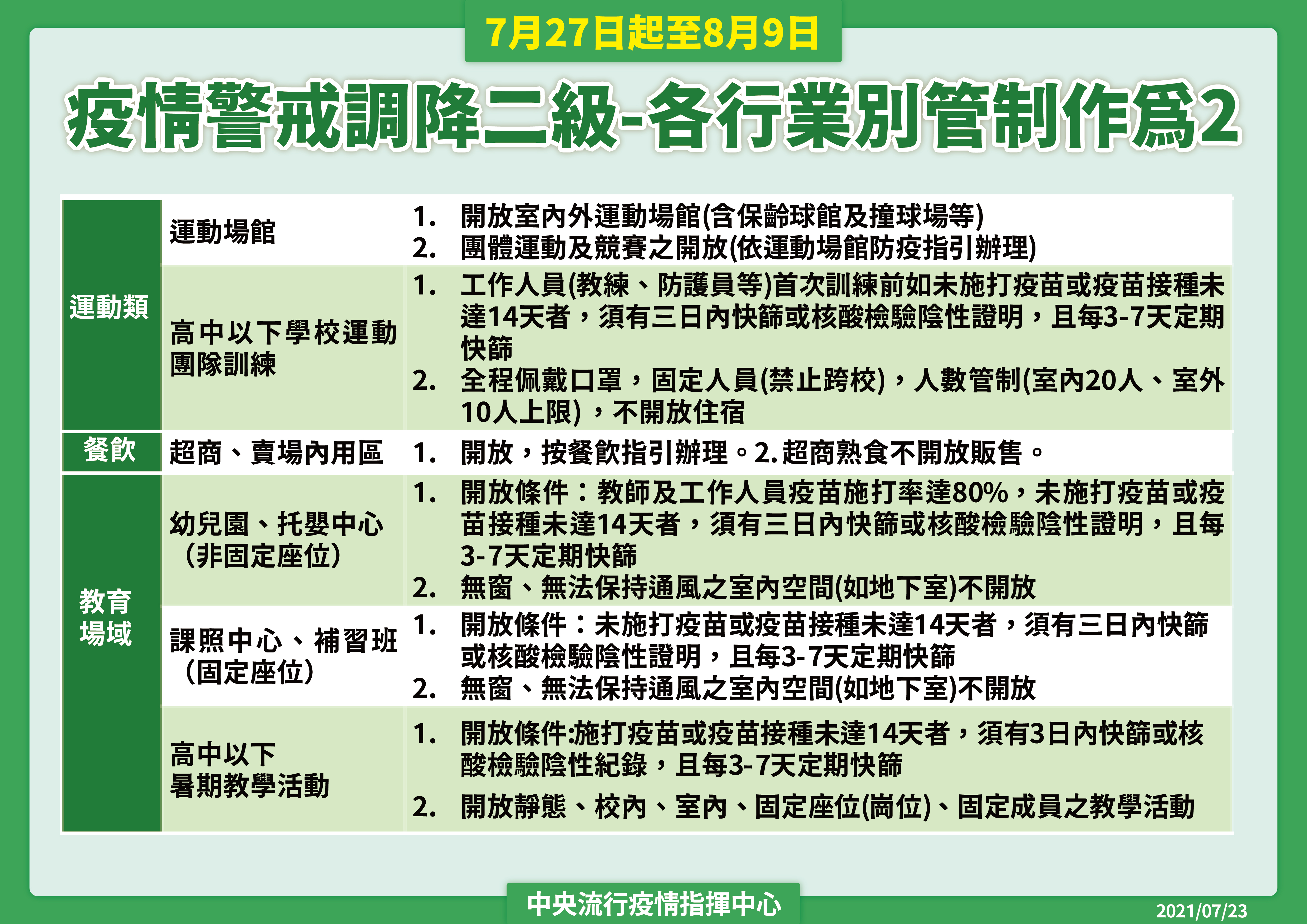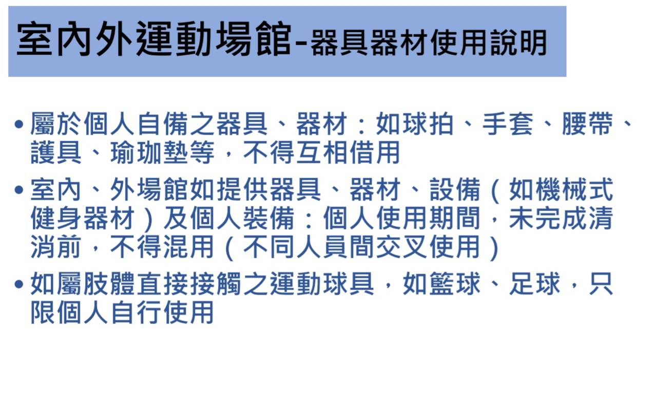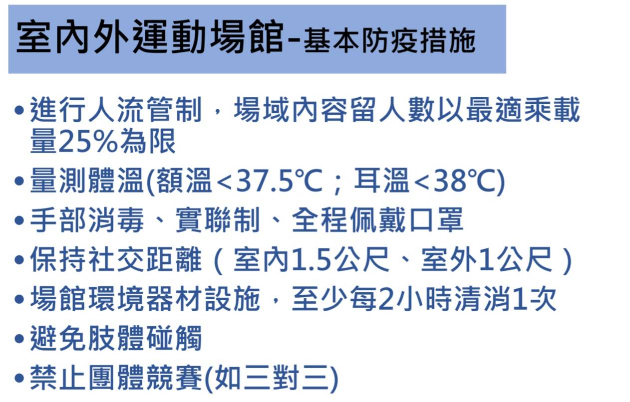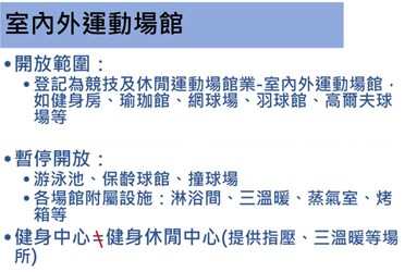 運動局說明,依據教育部體育署公告,適度開放對象為商業登記屬「競技及休閒運動場館業」的私人室內、外運動場館(游泳池除外),但各場館附屬設施,如淋浴間、三溫暖、蒸氣室、烤箱等仍不得開放。