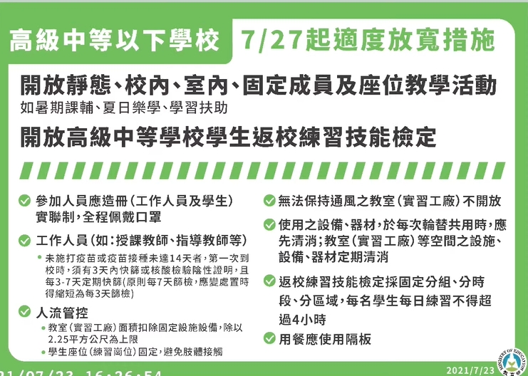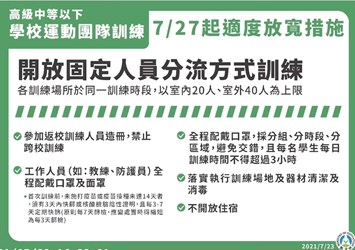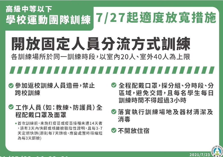 另外,國民運動中心、港區運動公園(不包括所轄游泳池及跳水池)配合防疫規定及防疫管理指引得開放使用;公立戶外運動場域方面,若現場有專人管理,可落實並管控實聯()制者,得開放使用;步道、操場或田徑場等屬走動式不接觸設施亦開放使用,但附設兒童遊具或體健設施等因難以保持社交安全距離、即時消毒及落實實聯()制,仍暫停開放。