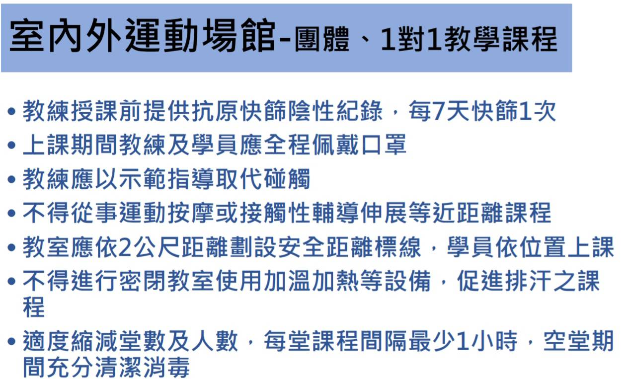 場館業者應遵循防疫管理指引,場域內容留人數以最適承載量50%為限、實聯制、全程佩戴口罩、保持社交距離、個人自備器具或器材不得互相借用,如由場館提供器材或器具,轉換使用者前後應消毒、器材及設備應維持間隔開放使用,並符合1.5公尺社交距離,如無法維持則該區域不開放、加強環境、器材消毒清潔工作,至少每2小時清潔消毒1次、業者應於撞球檯及保齡球道前,提供酒精、拋棄式擦拭布,每球檯及每球道以2人為限、教練未施打疫苗或接種未滿14天者,於第1次授課前,應提供3日內快篩或PCR檢驗陰性證明,且每37天需再定期快篩,業者應造冊紀錄。