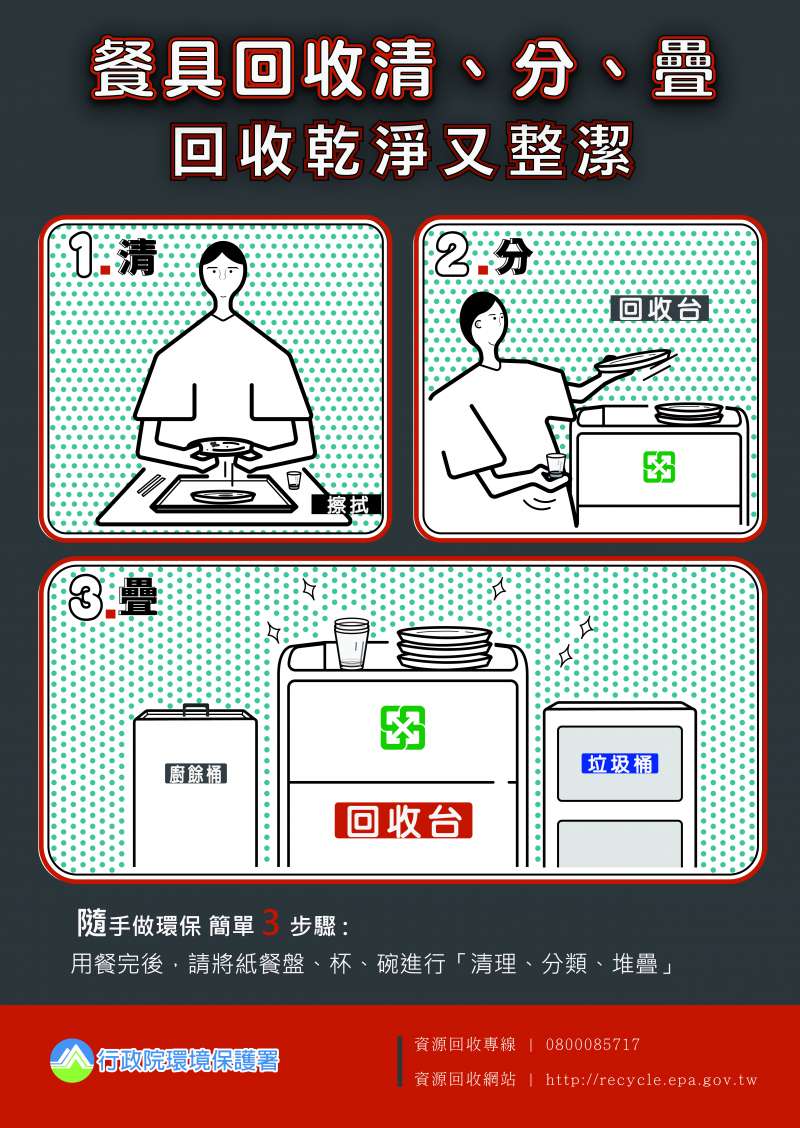 環保局呼籲,消費者用餐後響應回收3步驟「清理、分類、堆疊」,簡單回收步驟就可減少回收人員的辛勞;另因紙餐具內層有塑膠淋膜,交付回收業者或清潔隊回收時,請與一般紙類(如報紙.紙箱)分開回收,落實分類,一同減少廢棄物產生,為環保盡一份心力。