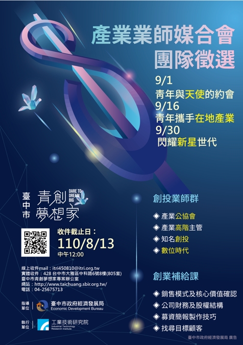 經發局表示,市府「青秀台中」青年政策多管齊下,設立青創夢想家單一服務窗口,提供資金協助、孵化培育、投資媒合、串聯交流、輔導取得政府資源等五大功能,打造台中成為創業友善城市。產業業師媒合會活動申請自即日起至8月13日中午12時截止,相關資訊請至台中市青創夢想家官網 https://www.taichung-sbir.org.tw/ 查詢,或洽專案辦公室專線04-25675713。(7/28*6)*經濟發展局
