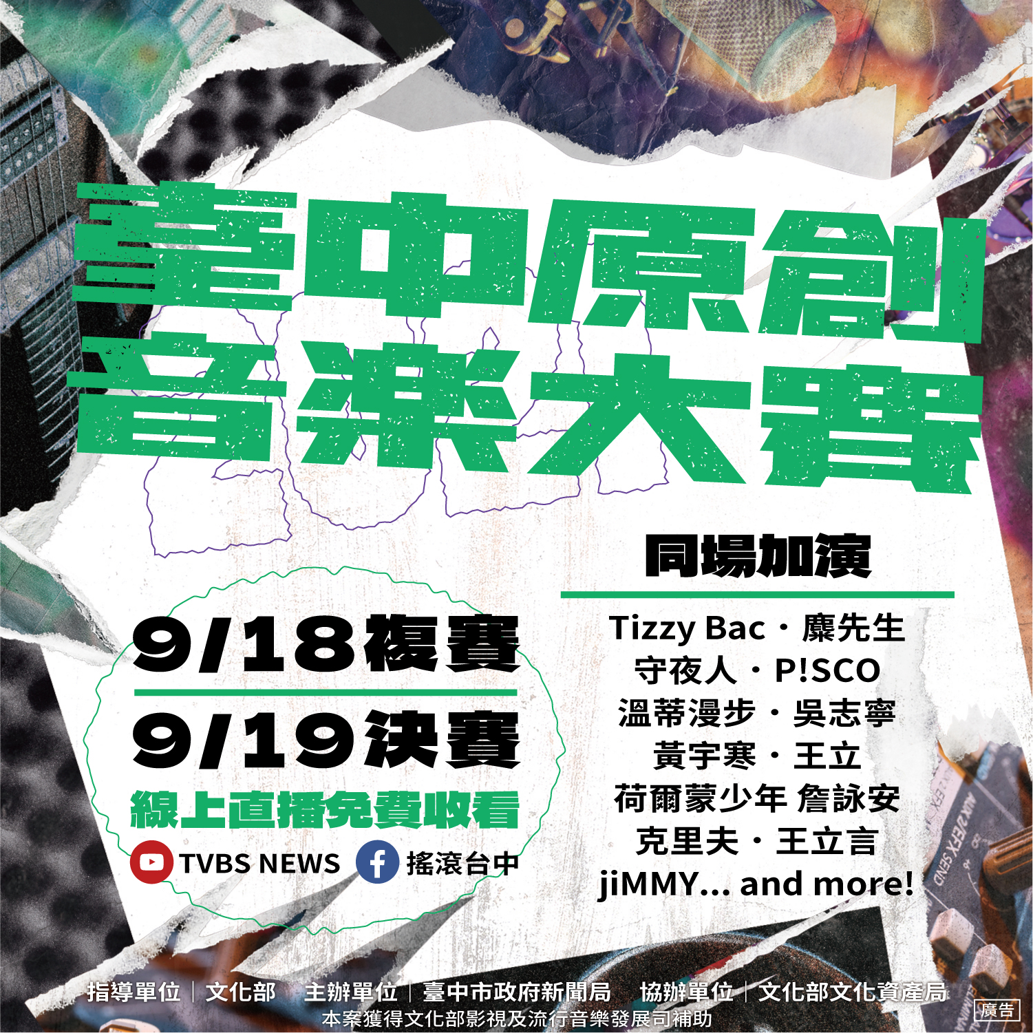 新聞局指出,台中原創音樂大賽獲文化部經費補助,由新聞局主辦,疫情期間為了保護參賽者跟觀眾的健康安全,賽事、講座講唱和人氣樂團加演的節目內容,91819日將全程線上直播,演出人員及工作人員將依中央流行疫情指揮中心指引妥善做好防疫措施,歡迎到搖滾台中Facebook粉絲專頁(https://www.facebook.com/RockInTaichungMusicFestival/ )或TVBS NEWS YouTubehttps://www.youtube.com/user/tvbs )即可免費收看,更多消息請至搖滾台中Facebook粉絲專頁或Instagramhttps://www.instagram.com/rockintaichung/ )查詢。