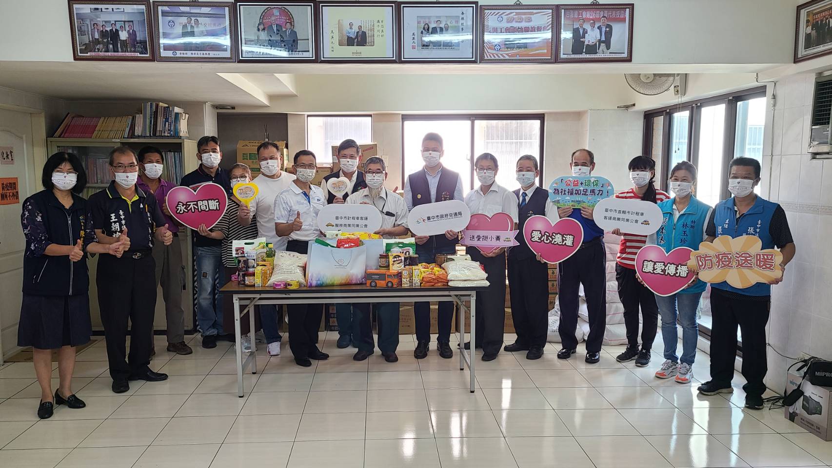 市府今天舉辦物資捐贈儀式,由社會局長彭懷真、交通局長葉昭甫致贈物資,「台中市直轄市計程車客運商業同業公會」與「台中市計程車客運服務商業同業公會」代表接受,台中市直轄市計程車客運商業同業公會榮譽理事長陳春棟特別到場,向社會局及交通局致謝。