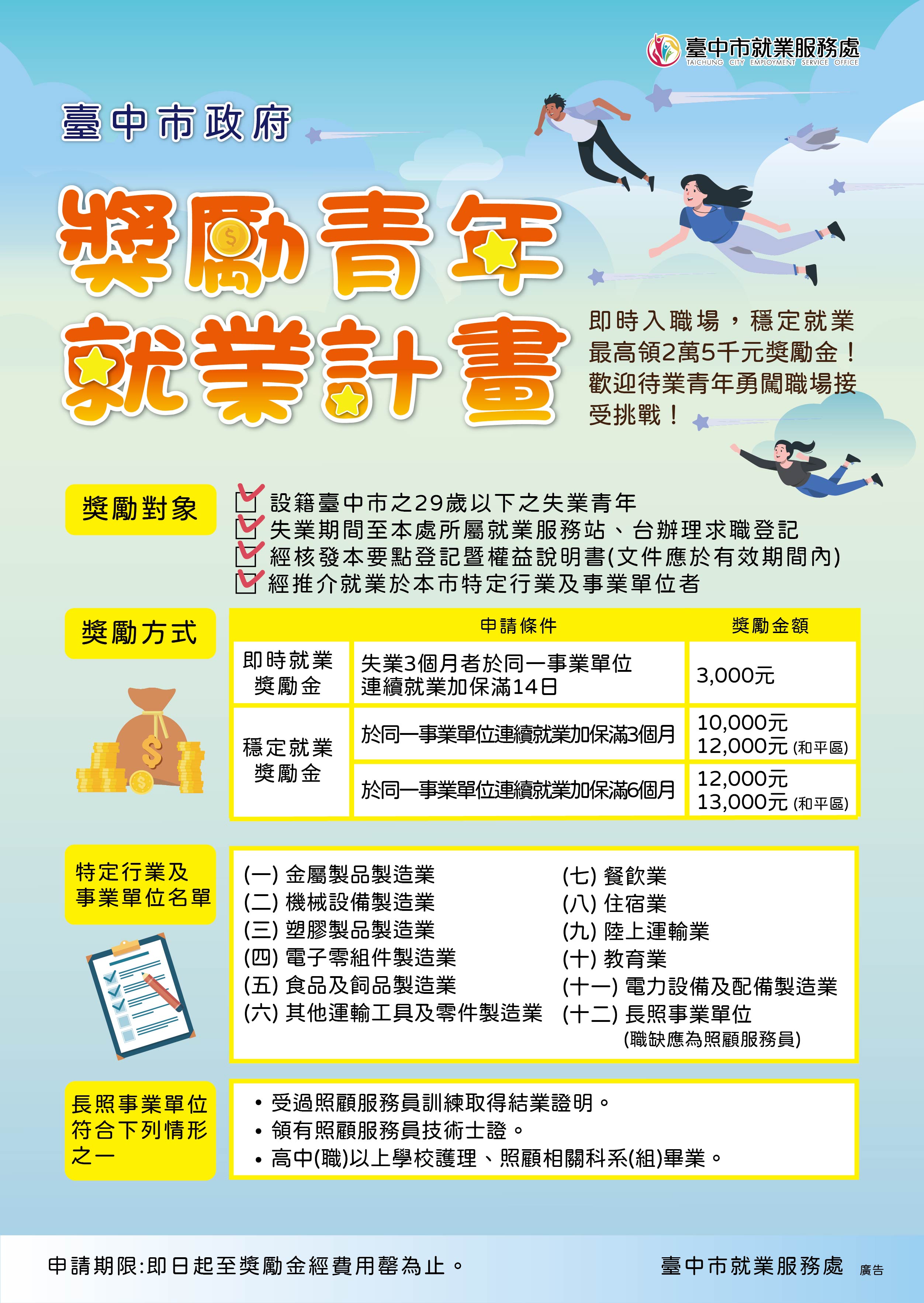 疫情期間為協助青年順利媒合上工,台中市政府除創新以全視訊服務辦理徵才活動外,並推動「獎勵青年就業計畫」鼓勵待業青年積極求職,設籍台中市29歲以下青年經推介就業滿一定期間最高可領2萬5千元就業獎勵金,計畫開辦至今,已有逾4,000名青年成功就業,高達9成以上青年回饋表示計畫可增加求職動機及協助度過就業初期磨合期。