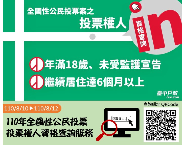 民政局表示,8月10日至12日止,民眾憑身分證字號及生日即可至內政部戶政司網站(https://www.ris.gov.tw )查詢,或到戶籍地區公所閱覽投票權人名冊。另立委罷免投票部分,則可到台中市第2選區戶籍地區公所閱覽是否具備投票資格,若對查詢結果有疑義,請於閱覽期間內,向戶籍地區公所申請更正,以保障投票權益。(8/11*8)*民政局