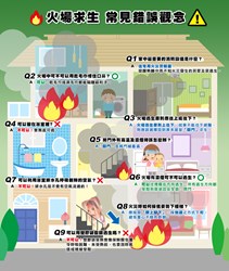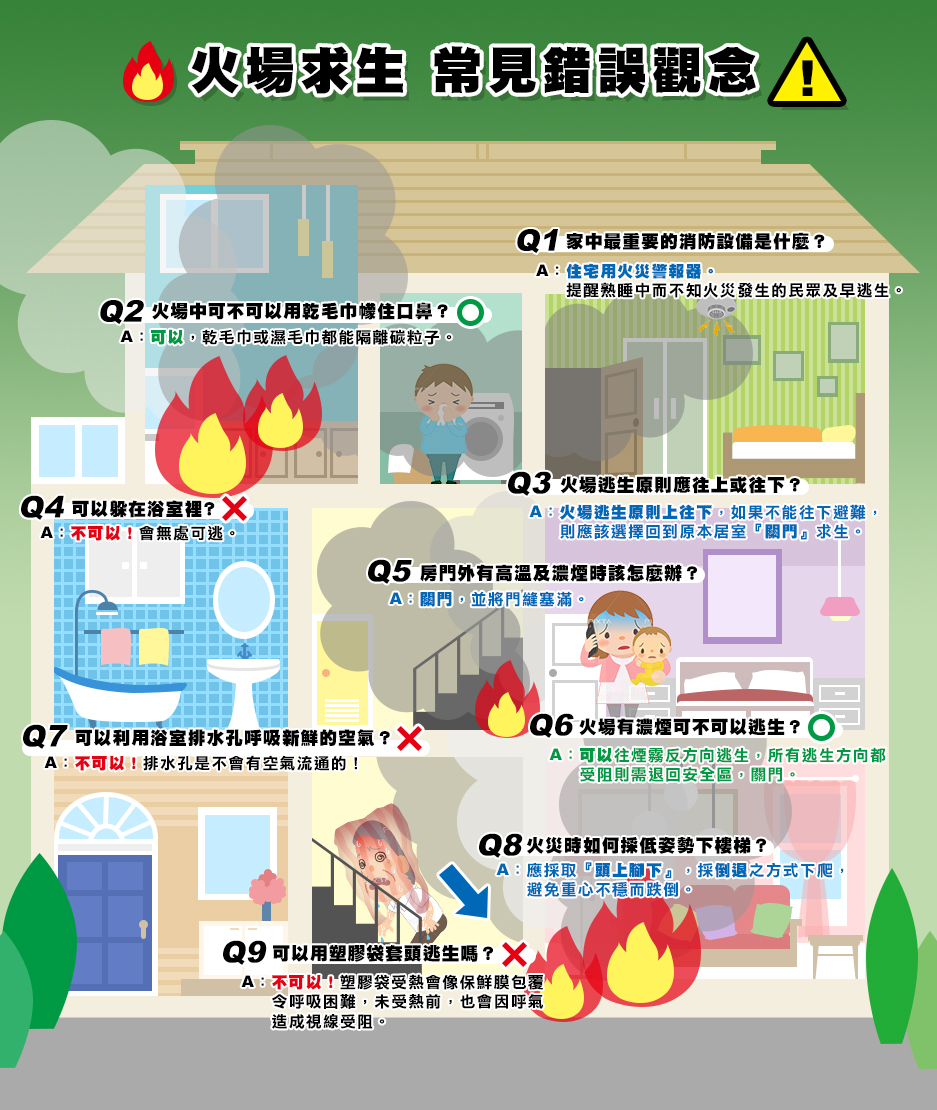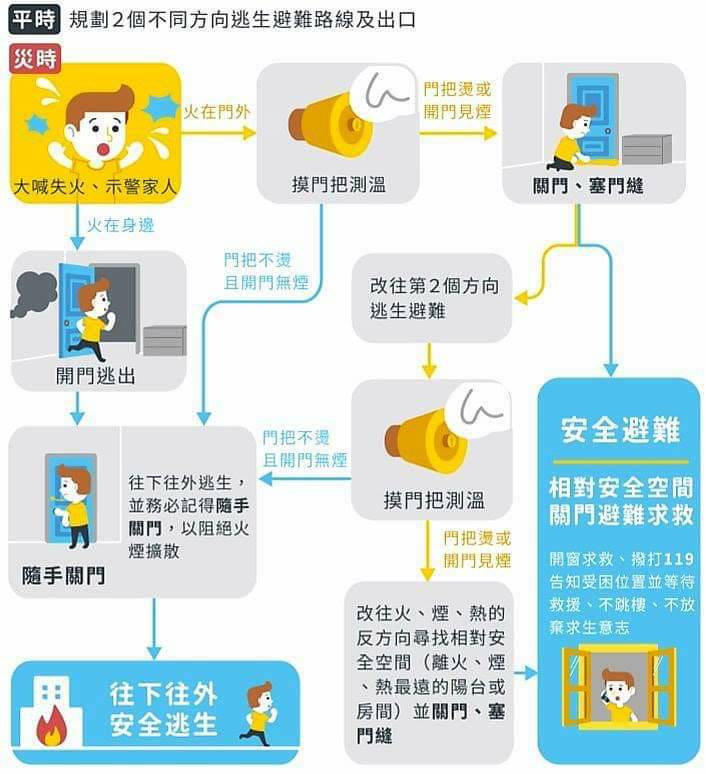 消防局提醒,民眾應培養正確的火場應變逃生觀念及行為,遇到火警立即大聲通知家人,環境允許下,往下、往外逃生,並隨手關門;若暫時逃不出去,則先做暫時性的避難求生,儘量找有防火門能緊閉且開窗的房間暫時避難,千萬不能躲浴室;並打119告知避難處,耐心等待救援;另如房間設有空調設備,應優先關閉空調。更多防災知識請上網站 (https://bit.ly/3CTzjF5) 查詢。(8/15 13)*消防局