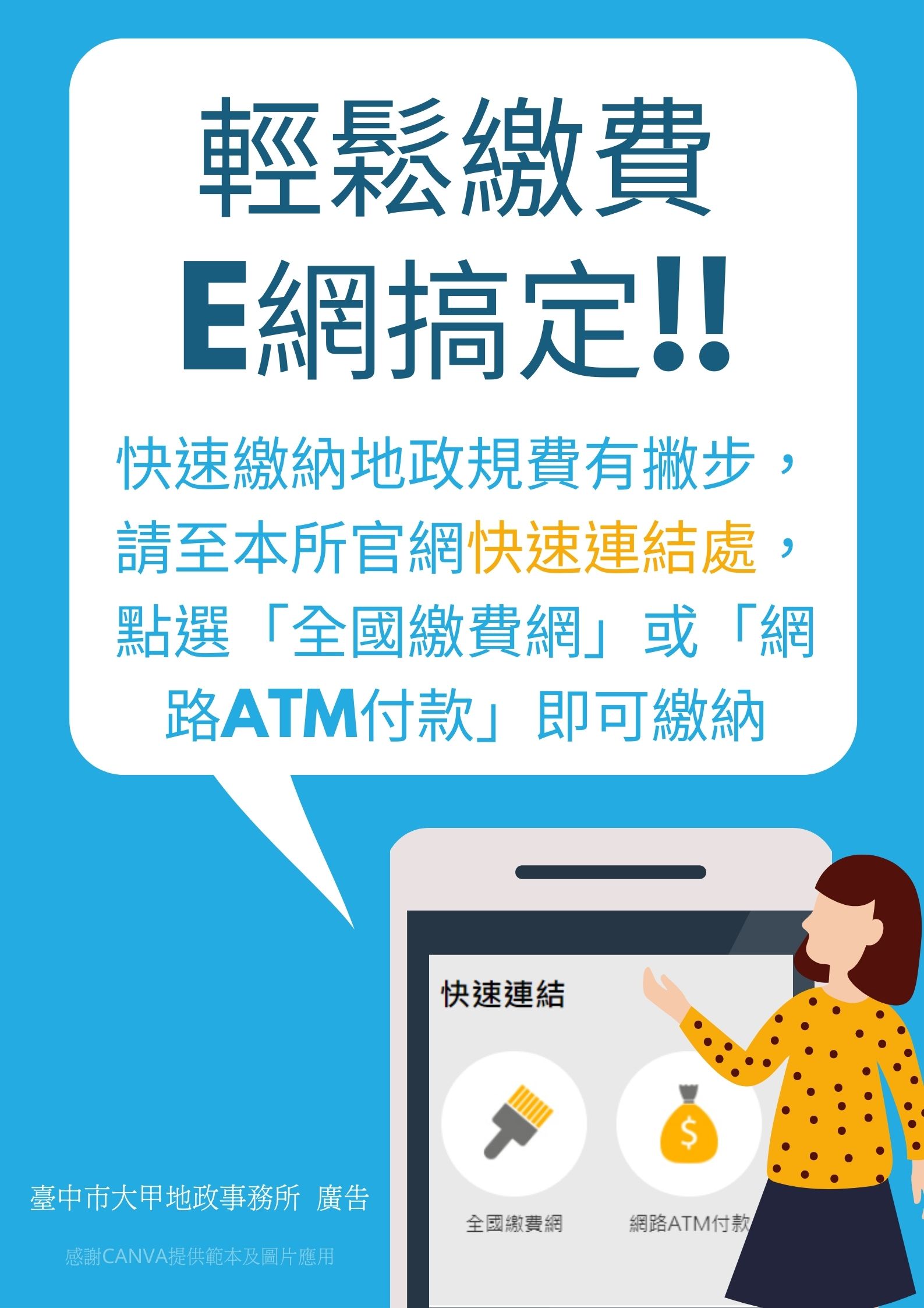 便利民眾申辦地政業務,台中市政府推廣內政部地政司「數位櫃台」網路服務,除能線上申辦土地登記,繳費也可選擇臨櫃現金、匯款、信用卡與各式行動支付等多元方式,且即日起大甲地政事務所也推出「全國繳費網」線上繳費服務,讓民眾在家點開網頁便能以金融卡輕鬆繳費,便捷又能兼顧防疫。