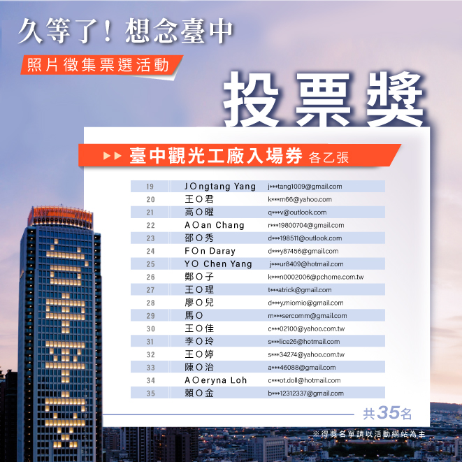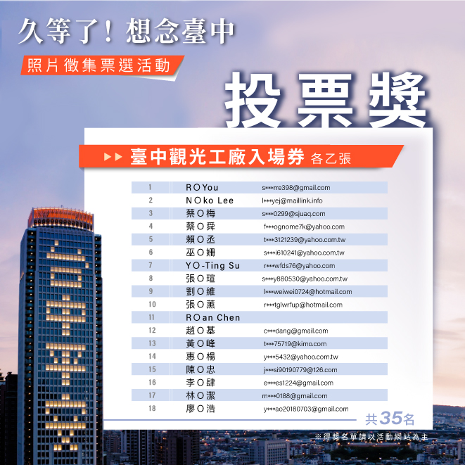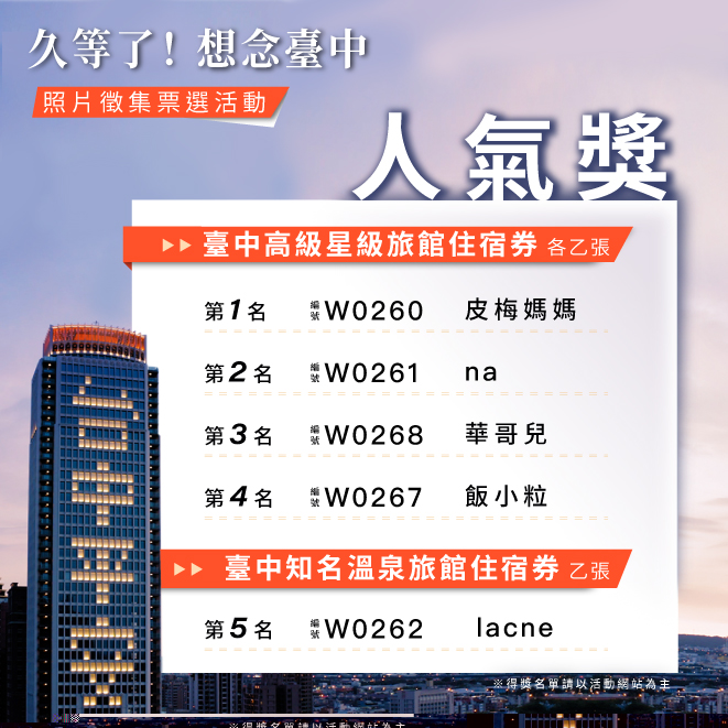 觀旅局表示,詳細得獎名單請上台中觀光旅遊網(https://travel.taichung.gov.tw/ )或大玩台中臉書粉絲團(https://www.facebook.com/taichungresort/ )查詢,並呼籲,疫情期間請民眾務必配合中央流行疫情指揮中心指引,多數景點已有限度開放,但防疫期間仍務必配合相關管制措施,出門全程佩戴口罩、勤洗手、維持社交距離,齊心守護你我健康安全,共同為安全環境盡一份心力。(8/18*18)*觀光旅遊局