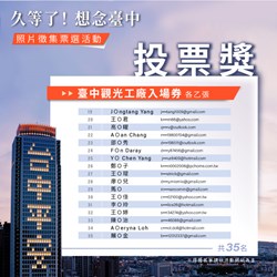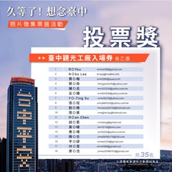 重溫台中旅遊美好回憶!台中市政府觀光旅遊局舉辦「久等了,想念台中─照片徵集活動」,獲民眾熱烈迴響,參選作品超過260件、含括135個景點,更有超過萬次總投票數。得獎名單今(18)日出爐,人氣前五名包括心之芳庭、宮原眼科、審計新村、柳川水岸步道、逢甲夜市,將獲得台中星級或溫泉旅館住宿券。歡迎思念台中的好朋友們在疫情趨緩且配合防疫政策的前提下,再訪台中入住安心旅宿,享受美好的旅行體驗。