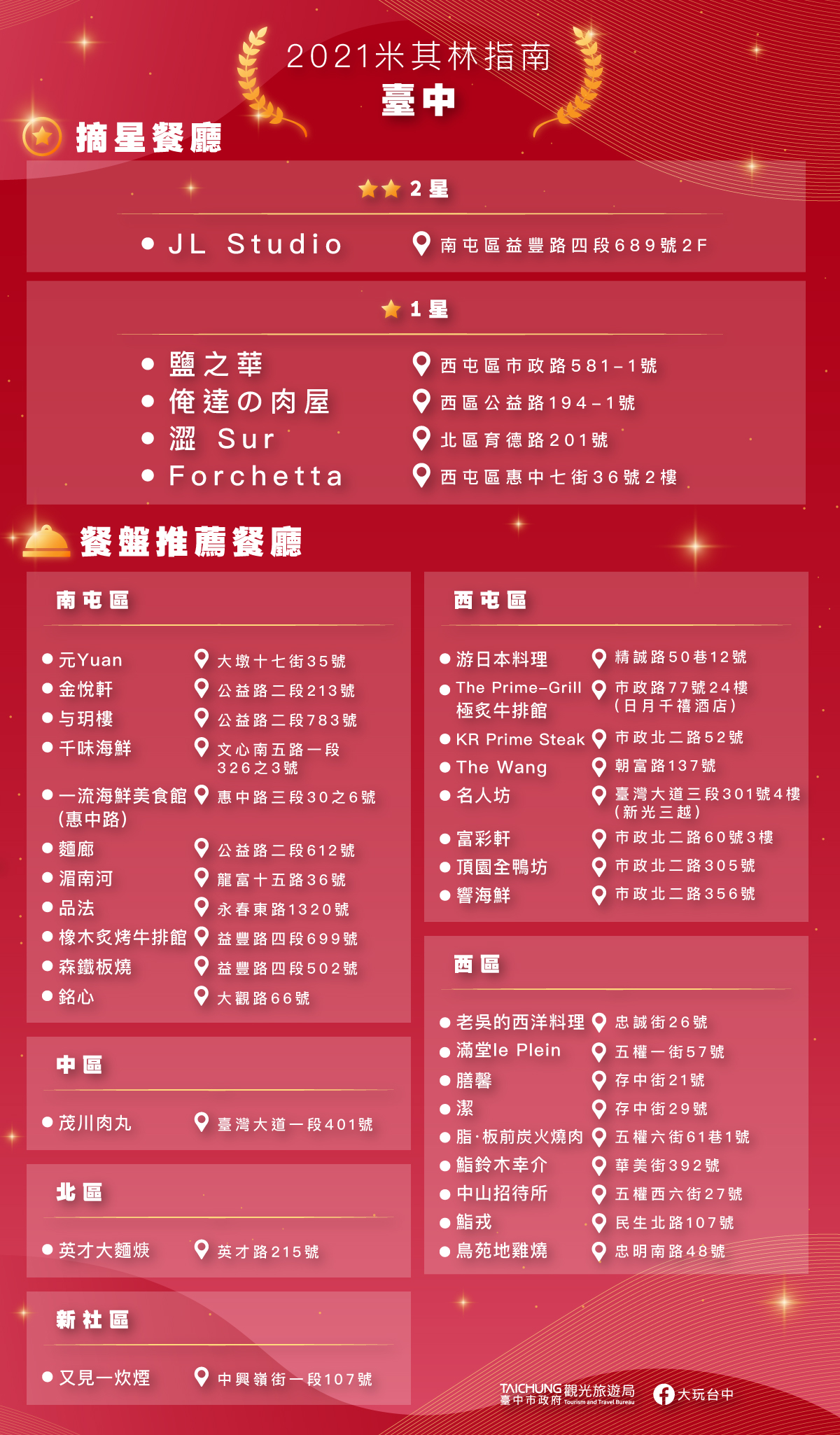 《臺北臺中米其林指南2021》今(25)日公布,台中共有5間餐廳摘星、31間餐廳獲餐盤推薦,另有33家餐廳為日前公佈的必比登推介名單,今年總計69間餐廳入選米其林指南,較去年新增加16家入榜,為台中美食觀光增添璀璨星光;此外,「澀Sur」主廚Ed 林佾華榮獲今年米其林年輕主廚大獎,繼去年「俺達的肉屋」主廚鍾佳憲,再次獎留台中!觀旅局表示,年年精進的名單顯示台中打拚「美食之都」的拚搏精神,也感謝米其林評審讓台中美食有機會走出台灣,躍上國際。