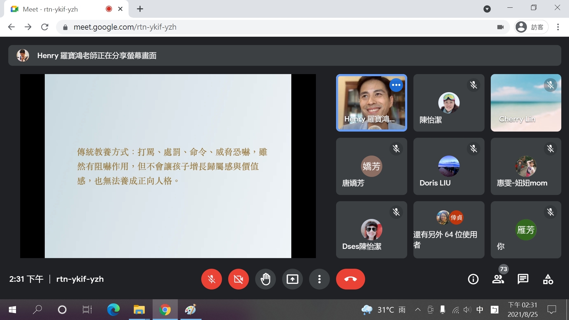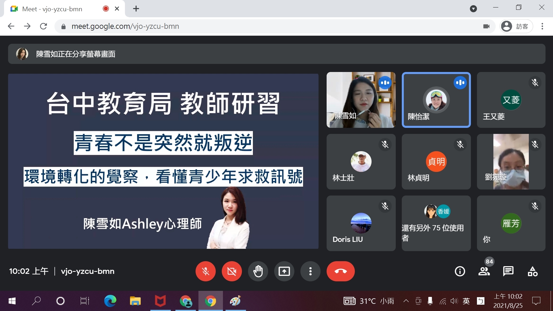 教育局指出,因應防疫並為讓更多教師及家長參與,此次講座採用線上教學方式,由兩位專家學者分別於線上與教師、家長對話,分享「青春不是突然就叛逆」、「大人先安定,與孩子彼此同理建立更穩固緊密的親子關係」的主題,帶領教師和家長認識情緒及如何管理情緒,並以溫和堅定的對話方式,經營親師生的溝通管道,引導孩子用適當方式表達及處理情緒,朝向正向思維。(8/26*7)*教育局