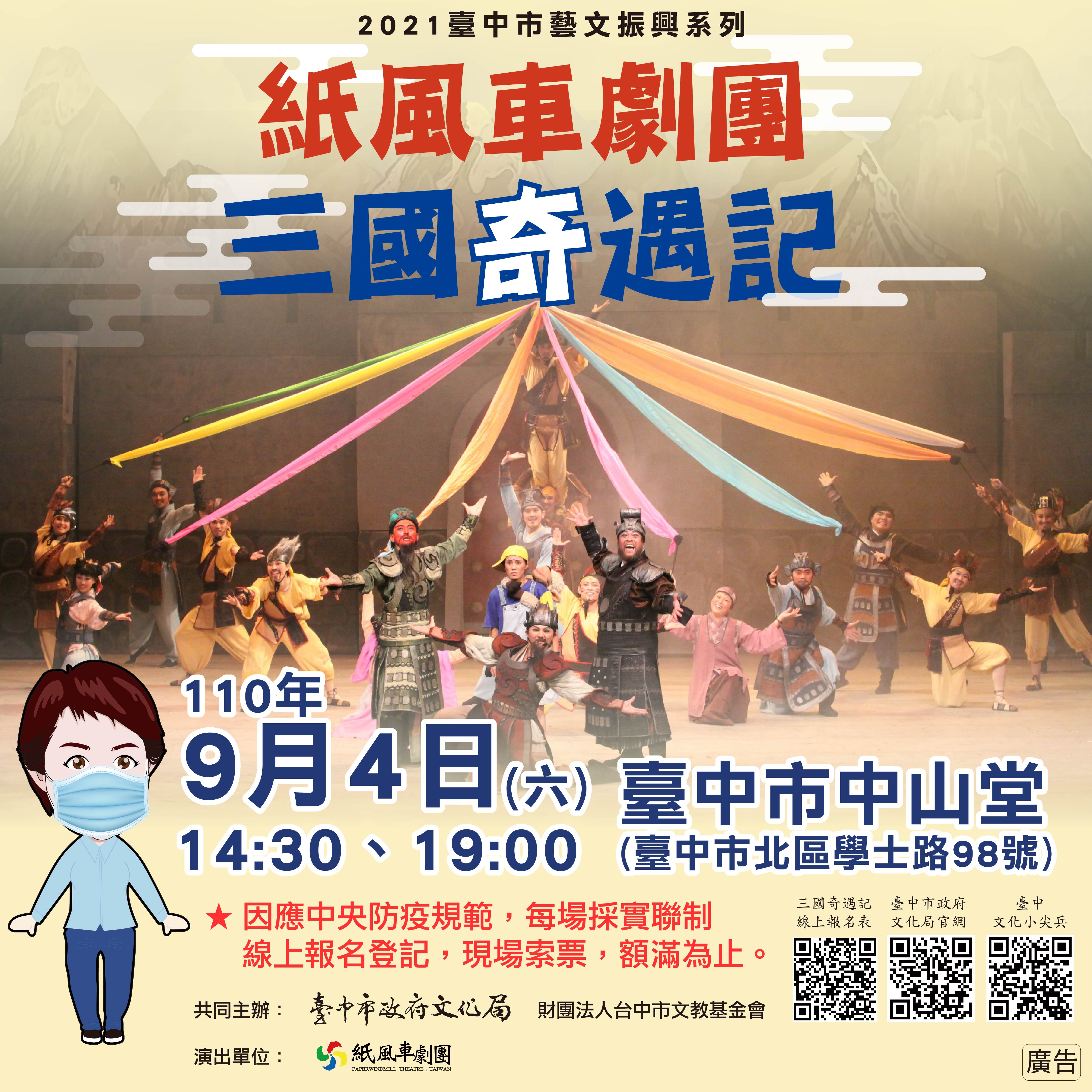 台中市政府文化局在確保防疫安全前提下,採穩健式解封、漸進式鬆綁,邀請兒童劇天團「紙風車劇團」於9月4日下午2時30分及晚上7時,在台中市中山堂演出兩場《三國奇遇記》。此次活動是疫情警戒降為二級後,劇團第一次公開演出,全台巡演就從台中出發,別具意義;演出票券將於8月30日中午12時開放線上免費索票,數量有限,喜歡兒童劇的觀眾朋友千萬別錯過!