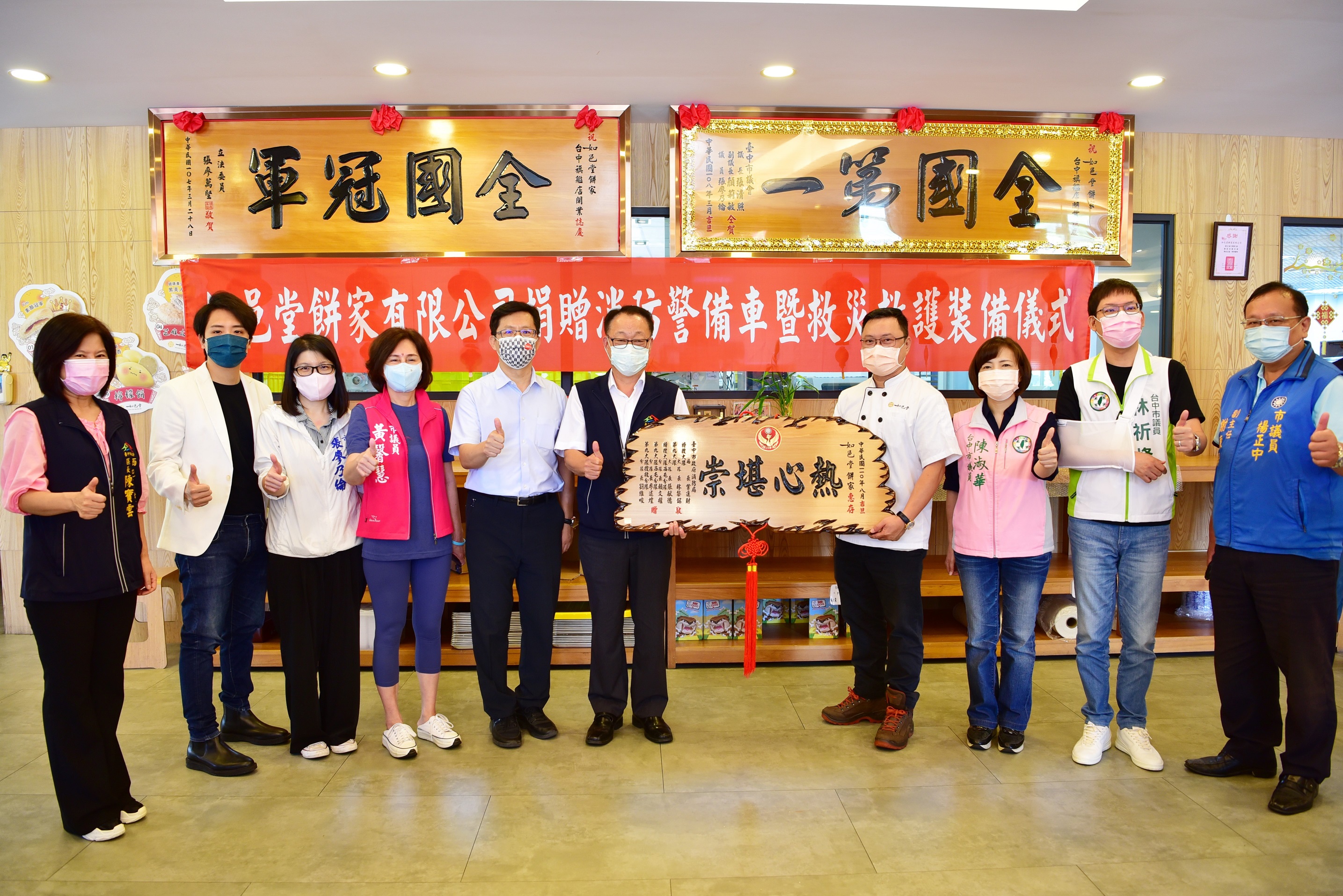 台中市著名伴手禮太陽餅比賽常勝軍「如邑堂」創始人林震東先生,有感於疫情期間消防人員救災、救護辛勞,捐贈市府消防局600萬元救災、救護裝備器材,今(28)日舉行捐贈儀式,消防局長曾進財代表受贈並回贈感謝狀,感謝林震東先生慷慨解囊,提昇消防單位戰力,保障消防人員執行勤務安全。