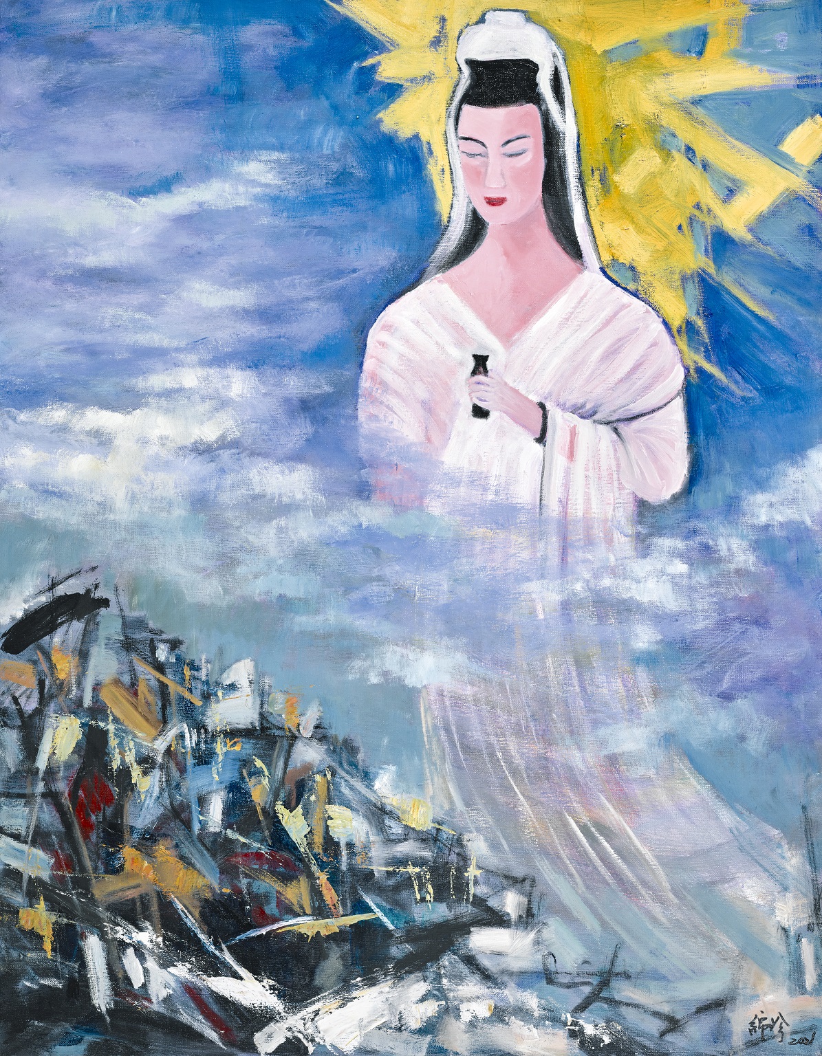 大墩文化中心分享,來自東勢區的護理師余沛倫今年首次參展,她在台中護專畢業後進入醫學中心工作十餘年,因為親人驟逝及工作中面對病患的傷痛百態,對生命產生許多疑問,從而開啟藝術創作之路,她在2020年以黑馬之姿,獲得第25屆大墩美展大墩獎和水彩類第一名。余沛倫的水彩畫《心之所向》表達疫情肆虐如同海象瞬息萬變,大海前一夜持續的狂風暴雨,雖然不知何時才能恢復往常,但希望就在雲霧後方,蟄伏等待,一切終將過去!