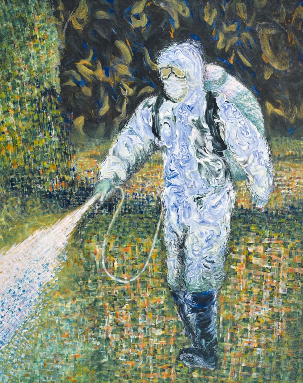 此外,王世慈的《上班好境界》,表現創意工作者居家辦公的樂趣,作品乍看是篆書,仔細端看才發現是英文書寫「Well Paid, Easy Job, Work from Home」,是突破書體限制的創意書法;膠彩類曾懷德的《防疫》,刻畫全副武裝的防疫人員,努力讓大地重現生機綠意;水彩類方草的《白色觀音》畫作,則向守護台灣防疫第一線的醫師、護理人員致敬。