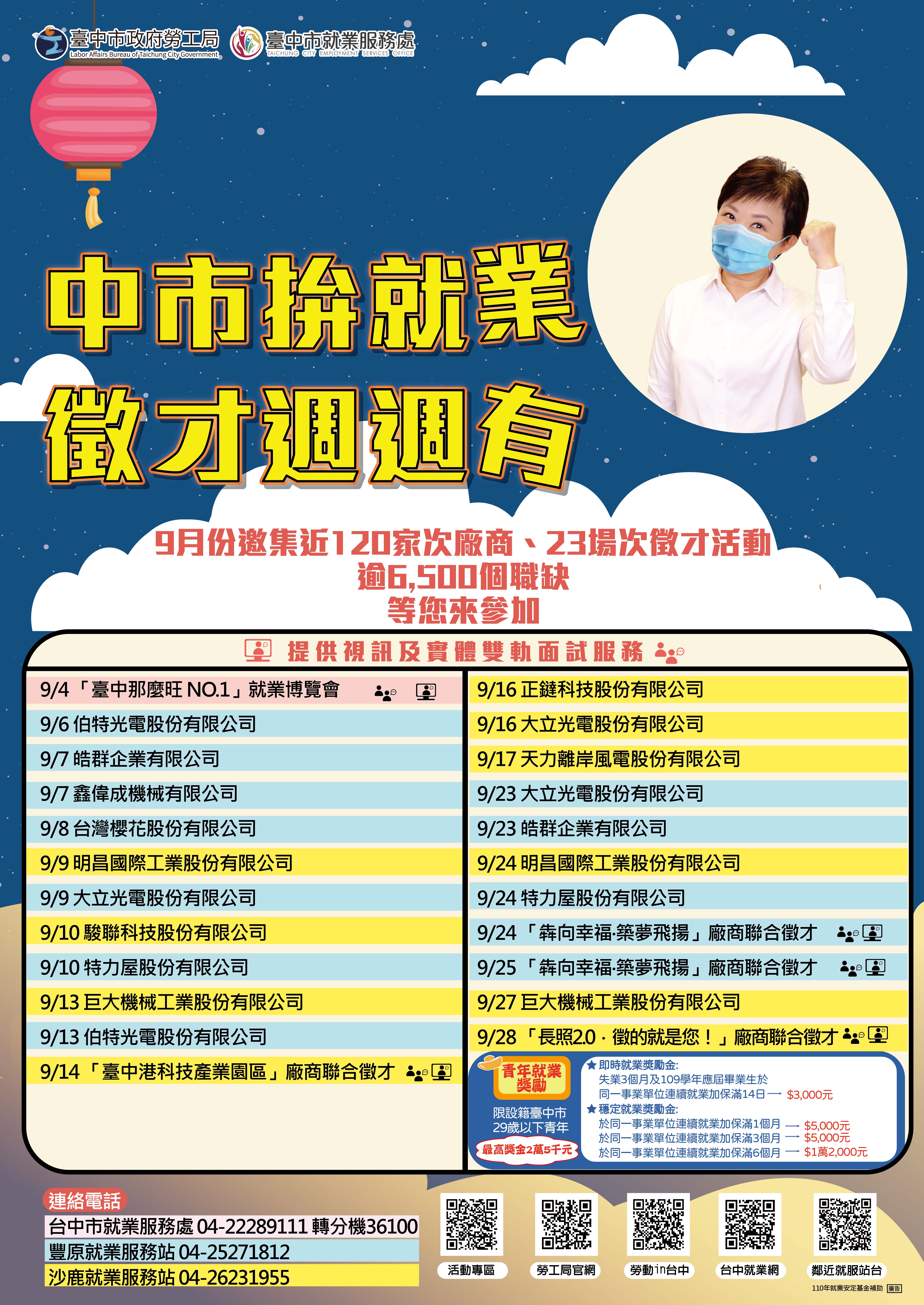 台中市就業服務處補充,參加徵才活動青年,符合相關條件可申請台中「獎勵青年就業計畫」,今年因應疫情放寬請領資格,新增應屆畢業生推介就業滿14日,即可申請3千元,就業滿1個月可再領取5千元,持續就業滿6個月,最高共可領2萬5千元就業獎勵金。活動詳情請至台中市就業服務處官網( https://www.eso.taichung.gov.tw/2580635/post ) 、電洽1999市民一碼通或撥打市府總機轉36100洽詢。(9/11*18)*勞工局