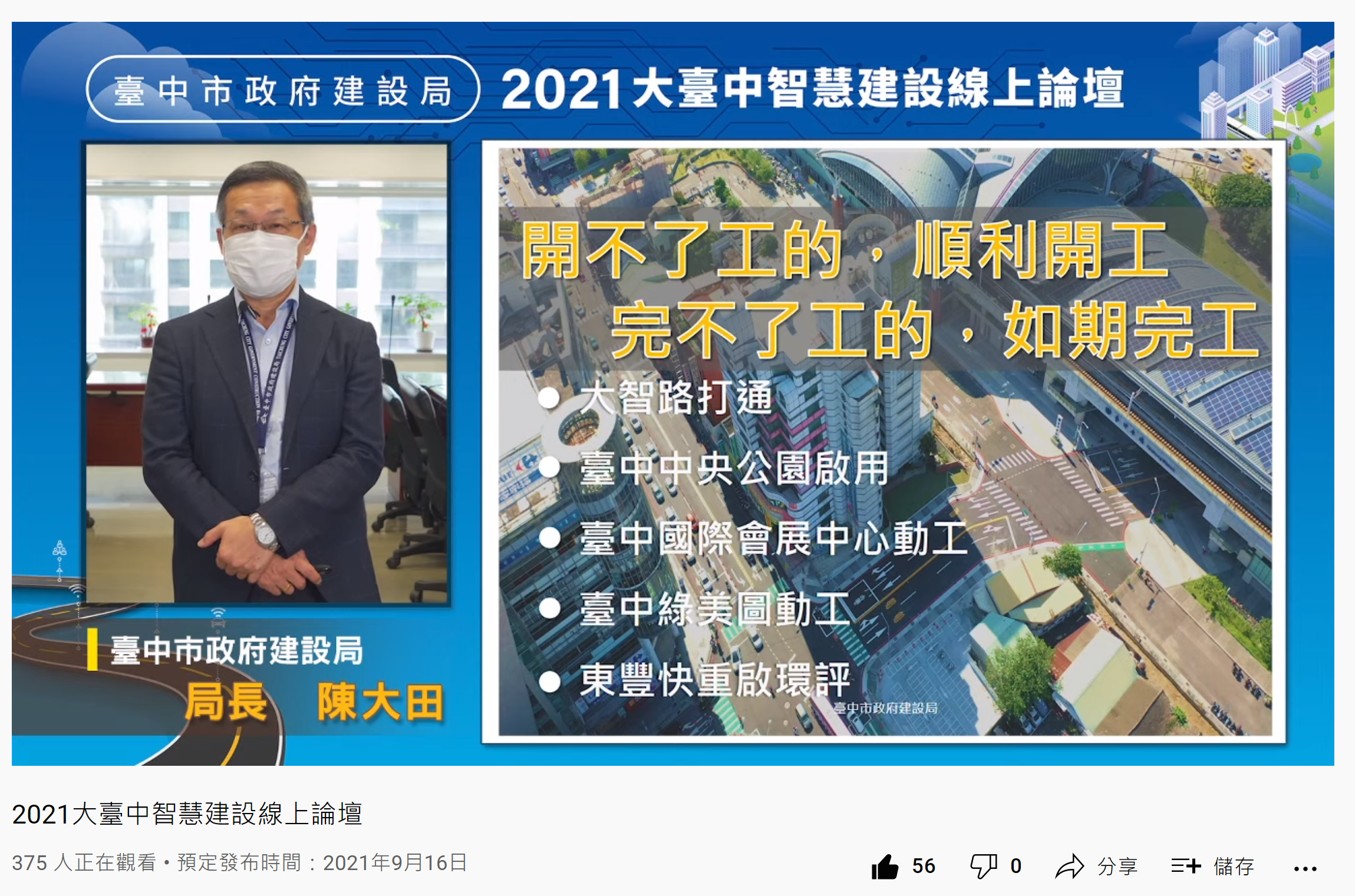 台中市政府建設局積極推動建設業務資訊化管理,辦理「e路有你-大台中智慧建設線上論壇」,邀請中央、六都代表及專家學者針對「智慧城市資訊與決策」、「智慧道路建設管理」、「智慧共融綠生活」等主題進行共14場演講並分享推動成果,今(16)日論壇由台中市政府秘書長黃崇典代表市長盧秀燕開場致詞,吸引YouTube直播人數最多達424人同時上線聽講,盼為公共政策創造新一頁的里程碑。