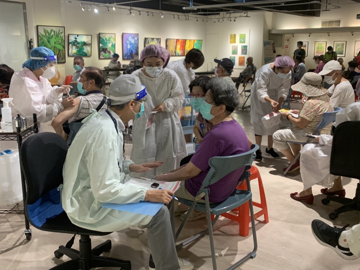 吳局長指出,台中市西區是匯集歷史、文化、宗教、產業的重要地點,轄內學校、文化設施眾多,有著「台中市文教區」的美稱,西區公所為提供市民大空間、動線好、有空調的接種場所,便向「大墩文化中心」洽借1樓藝文走廊第567展區,在不影響文化中心日常營運下,提供民眾舒適的接種環境,讓民眾接種疫苗兼賞藝文展覽;此外,位於太平區的「屯區藝文中心」也出借1樓演藝廳,協助太平區公所疫苗接種服務,讓民眾接種疫苗後,享受藝文美學的愜意空間。