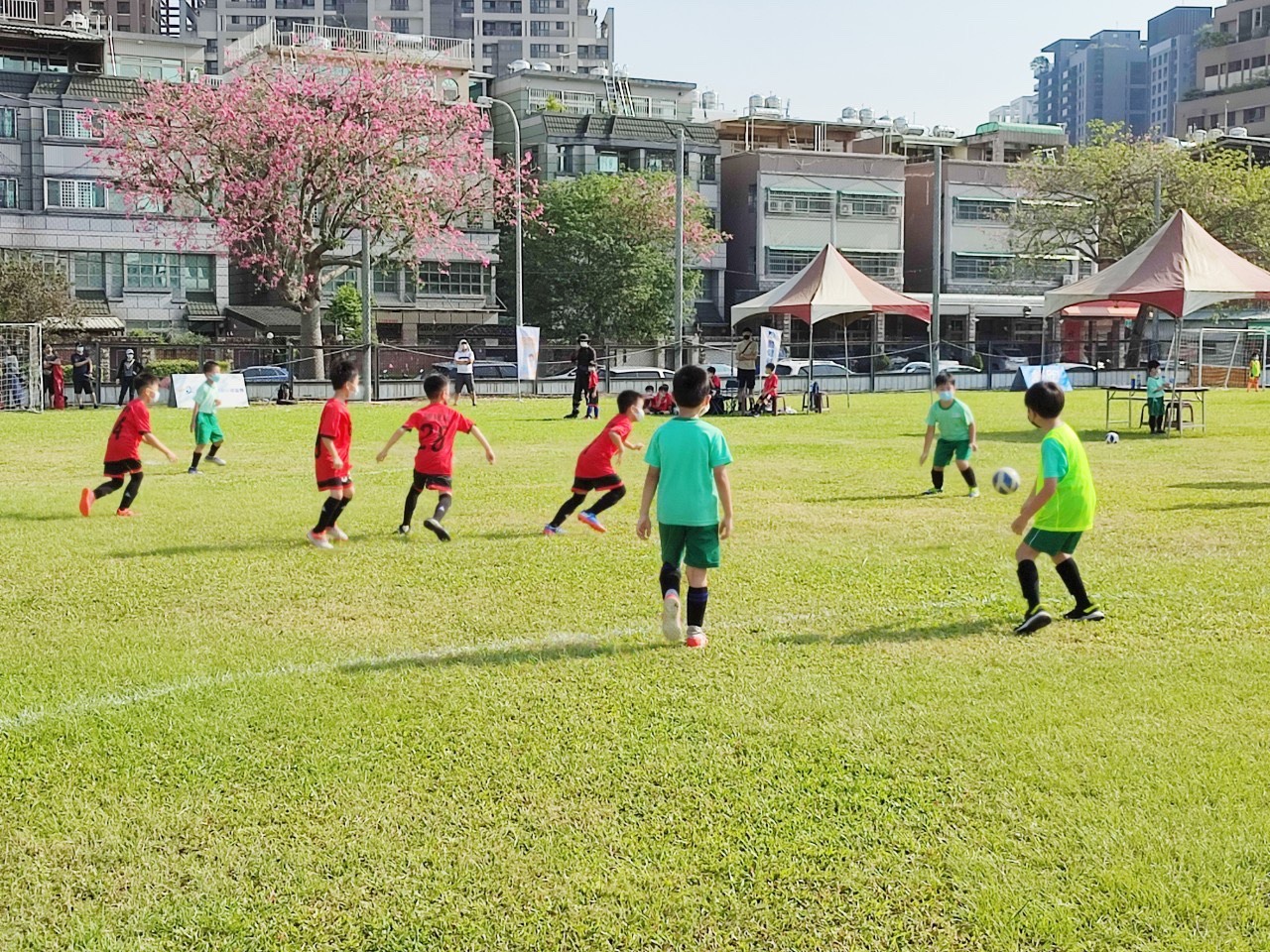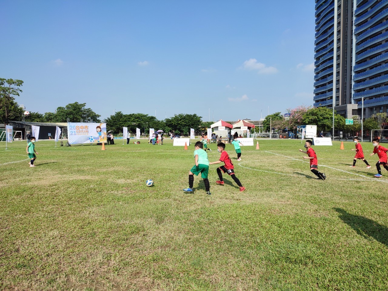 台中市政府運動局「2021社區足球深耕計畫—台中市社區足球節」於屯區、海線、山線及豐原4區陸續登場,今(25)、明兩日率先在台中朝馬專用足球場及清水運四牛埔仔運動公園舉行,有U6幼兒組、U8U10國小組,吸引33隊熱情參賽,體驗足球樂趣,運動局感謝中華民國校園社區運動聯盟協會共同推廣迷你足球運動,打造台中足球酷運動、酷城市!