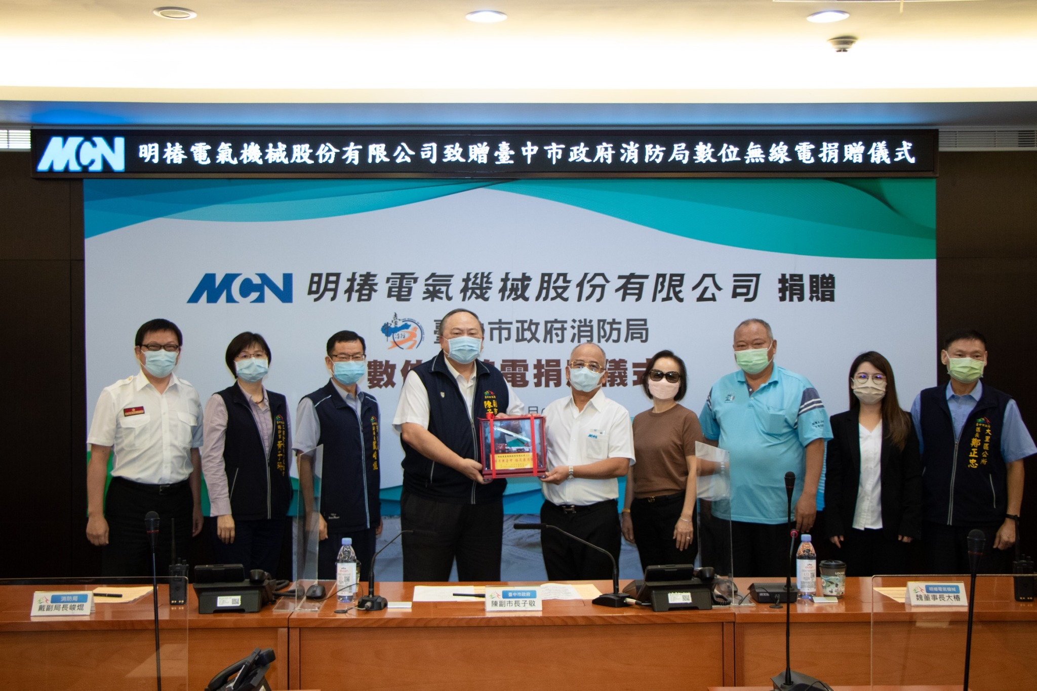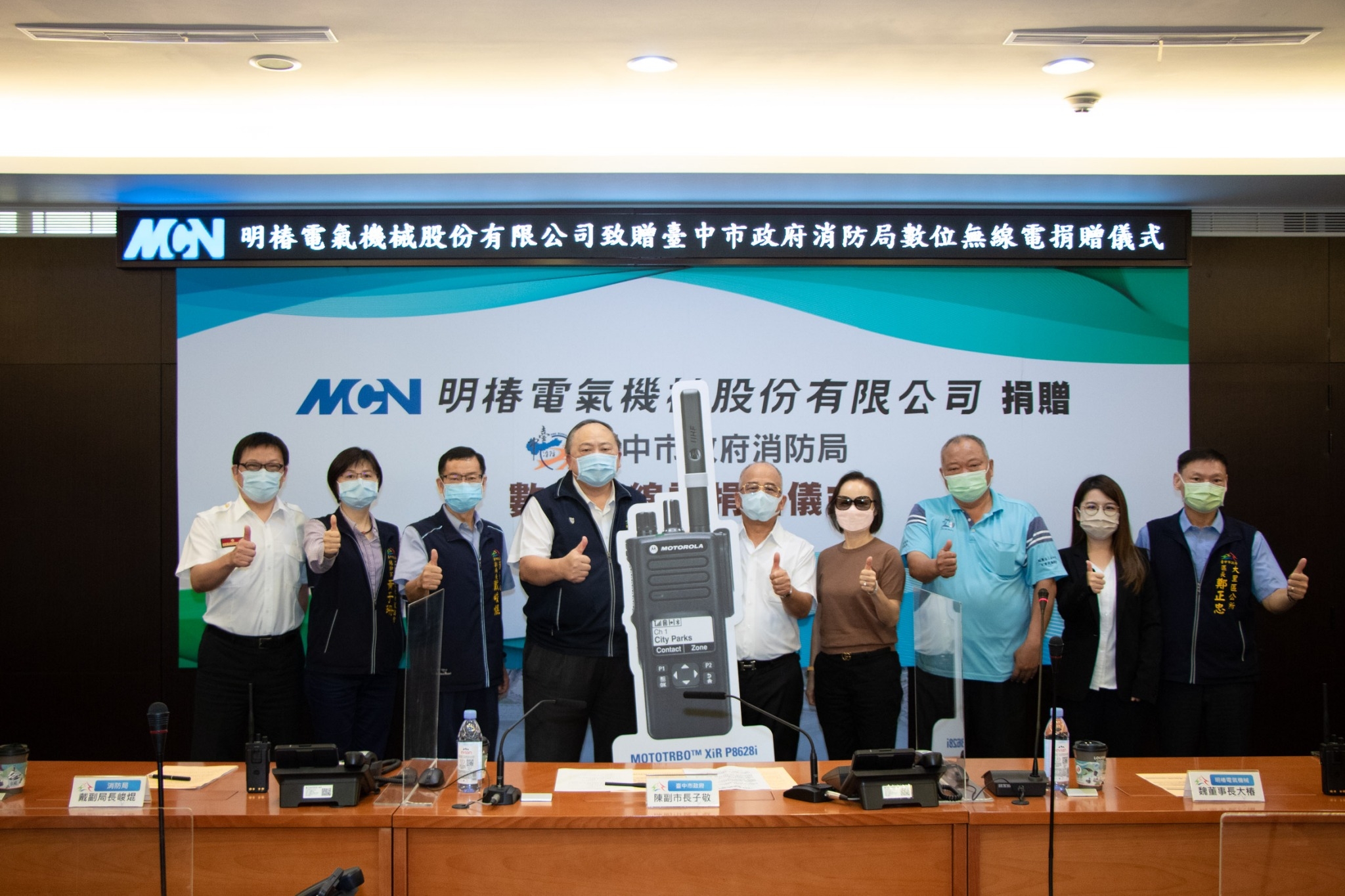 明椿電氣機械股份有限公司董事長魏大椿,有感於疫情期間消防人員救災救護辛勞,捐贈台中市政府消防局最新型數位式無線電共100組,今(4)日舉行捐贈儀式,由副市長陳子敬代表受贈。陳副市長感謝魏董事長慷慨解囊,新式裝備有更佳防水功能、通訊內容更清晰,有助加強救災現場通訊效能,提升消防戰力,保障消防人員執行勤務安全。