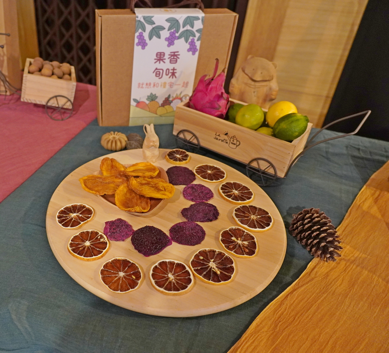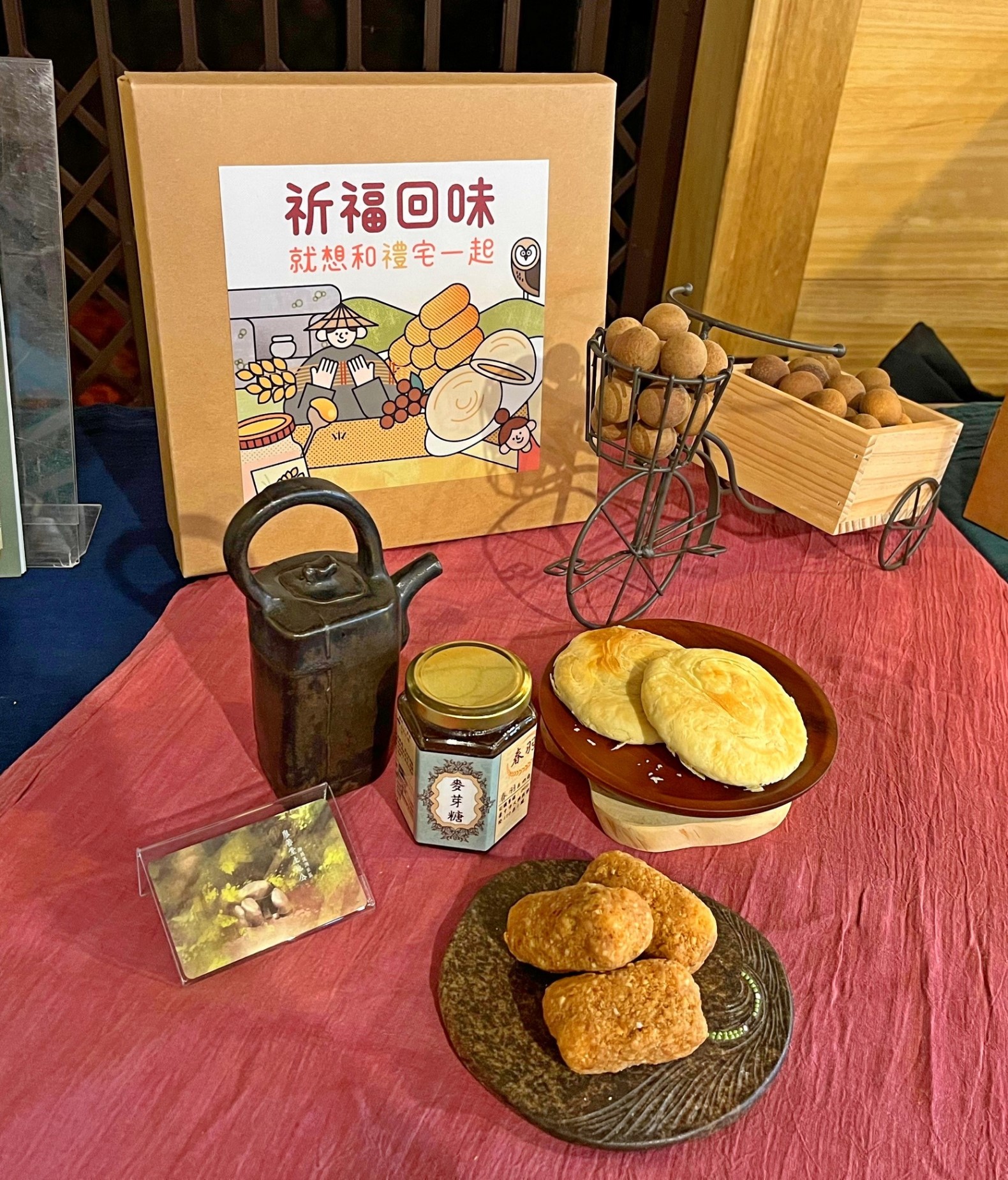 施副局長指出,「祈福回味」禮盒內含桂圓、麥芽糖、麻荖及土地公悠遊卡,甜蜜滋味有土地公的祝福;「微醺旅人」禮盒有紅酒、芒果乾、乳酪絲及海線文創品,最適合夕陽微風的海岸之旅;「果香旬味」禮盒則有各式果乾,飽含社區的自然風味;「舊城滋味」禮盒有經典的太陽餅、羅氏秋水茶、舊城故事漫畫與鳳梨乾,要讓舊城旺起來。所有產品皆來自在地社區,包括大雅區麥鄉休閒農業觀光協會、神岡區溪洲社區、外埔區農業創生協會、清水區牛罵頭文化協進會、霧峰區桐林社區及台中市幸福三寶文創產業合作協會。