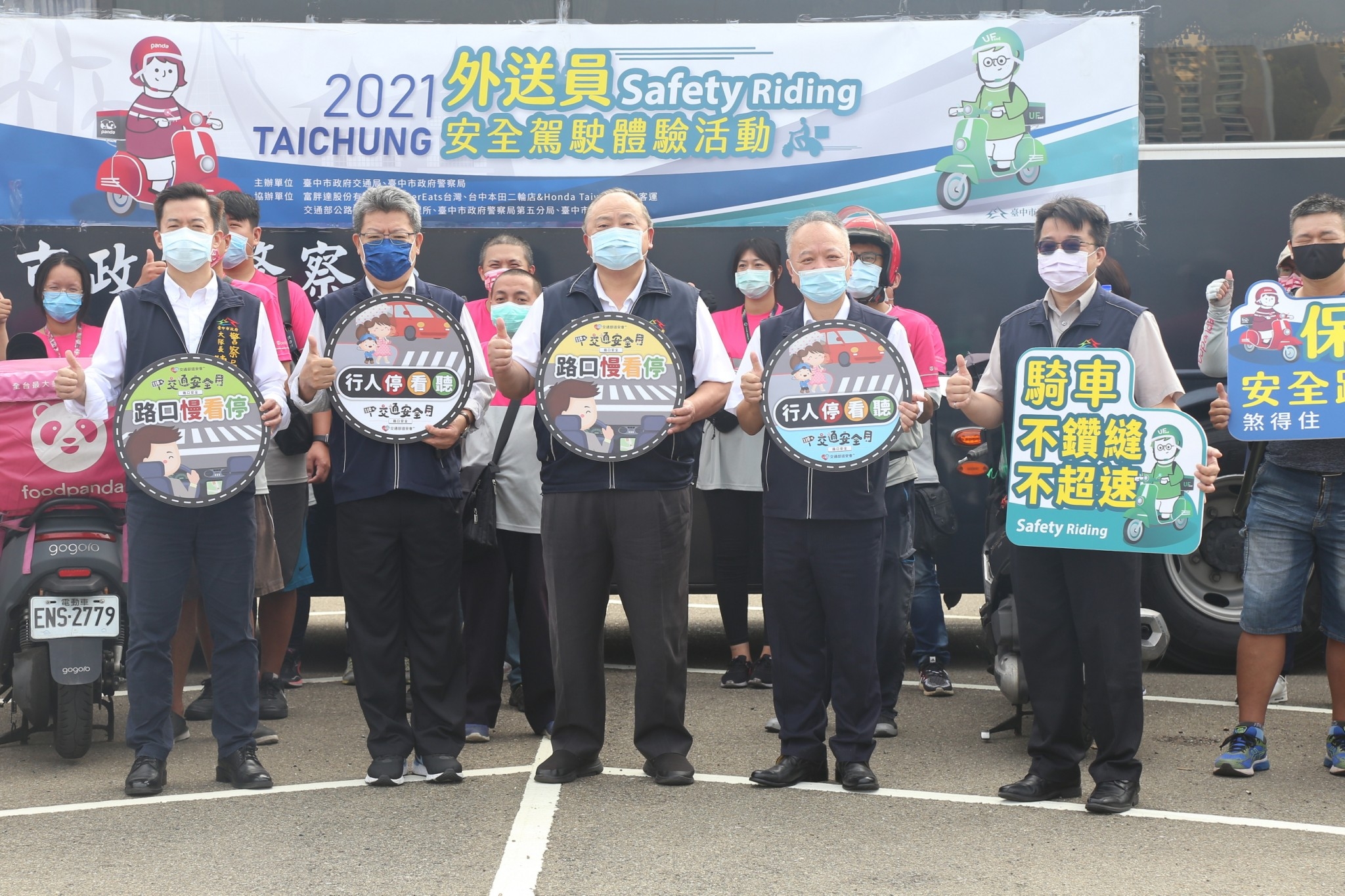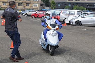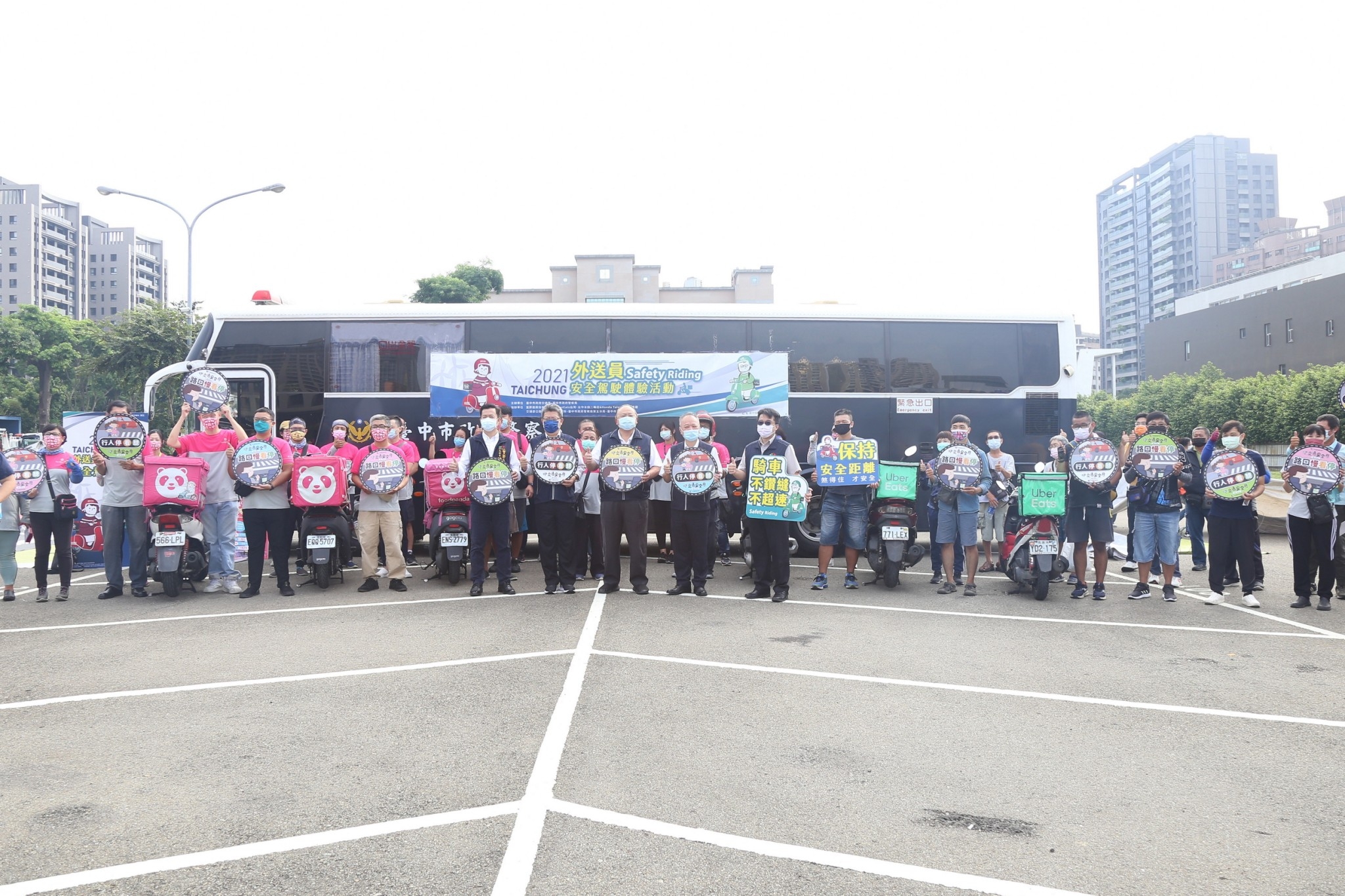疫情改變民眾生活及用餐型態,促使外送餐飲服務增加,為建立外送員對防禦駕駛、路權禮讓等安全觀念,台中市政府交通局與警察局今(15)日舉行「Safety Riding-外送員安全駕駛體驗活動」,以機車實技演練煞停距離認知、大型車視野死角及內輪差情境體驗、事故案例分享及職災賠償宣導等方式進行,向外送員宣導如何安全正確駕駛,吸引近80名Uber Eats及foodpanda外送員參加。