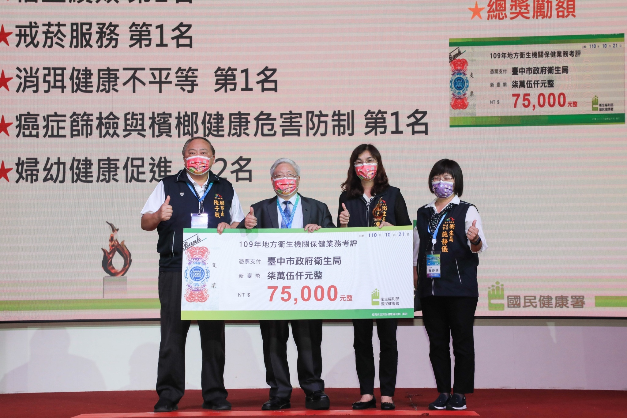 這次市府衛生局在考評中榮獲多項獎項,除整體工作表現的「保健業務類」榮獲第一組優等獎外,也分別榮獲稽查績效第一組第1名、戒菸服務第一組第1名、消弭健康不平等第一組第1名、癌症篩檢與檳榔健康危害防制第一組第1名及婦幼健康促進第一組第2名,未來將持續提供民眾健康照護服務。