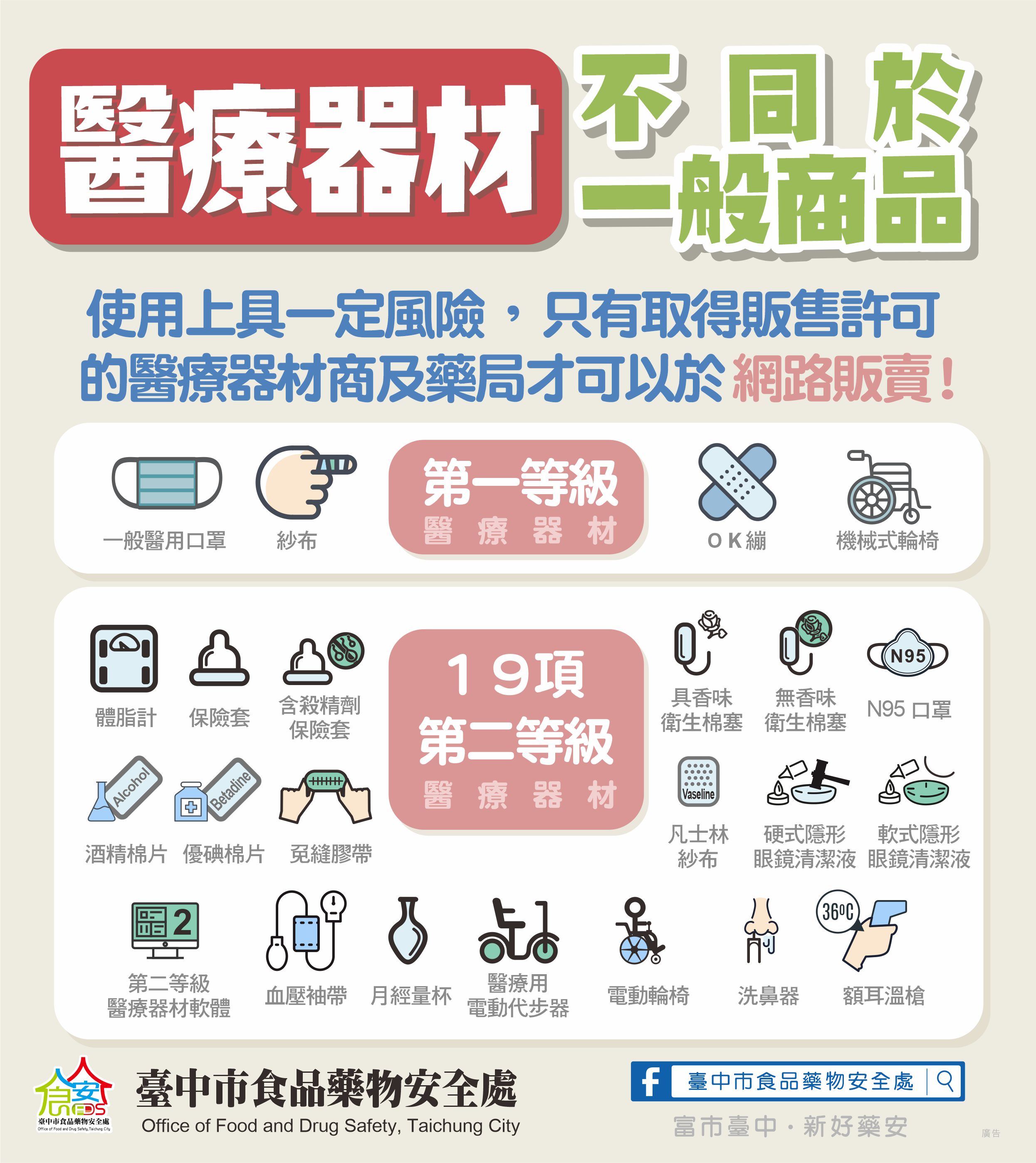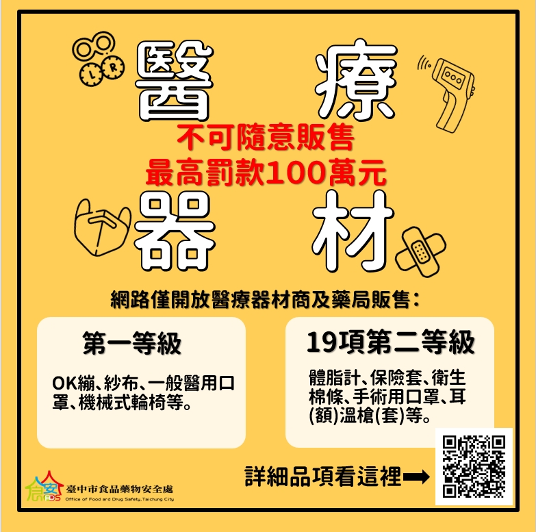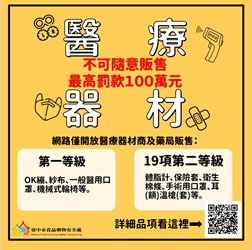 受新冠肺炎影響,口罩需求增加,部分民眾會把醫療口罩放上網路拍賣平台,台中市食品藥物安全處提醒,「醫療器材」不同於一般商品,只有取得販售許可的醫療器材商及藥局才可在網路販賣;同時也呼籲民眾,購買醫療器材須遵守「醫材安心三步驟:一認、二看、三會用」,包括認識醫療器材、看清楚包裝上載明的醫療器材許可證字號及使用時要詳閱說明書,讓使用更安全。