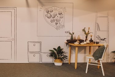 此外,此次展覽也特別邀請超過半甲子的老字號品牌「大振豐洋傘」,與日本花藝家木村貴史帶領的plantica花藝團隊,聯名設計「繽紛花漾傘」系列,雨傘搖身一變成為穿搭的時尚配件。身為國際珠寶競賽常勝軍的「磨樣 MODEYANG」,則將霧峰知名的「芋香米」意象,透過台灣玉、銀、檀木等媒材創作,用心刻劃在「玉()在一塊」對筷組。玉與筷的結合,象徵夫妻一同共食、共享、共伴生活。