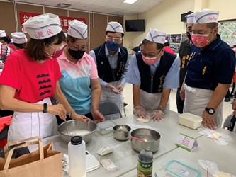 民政局長吳世瑋與西區區長王瑞嘉和學員一同體驗製作雪花糕的樂趣