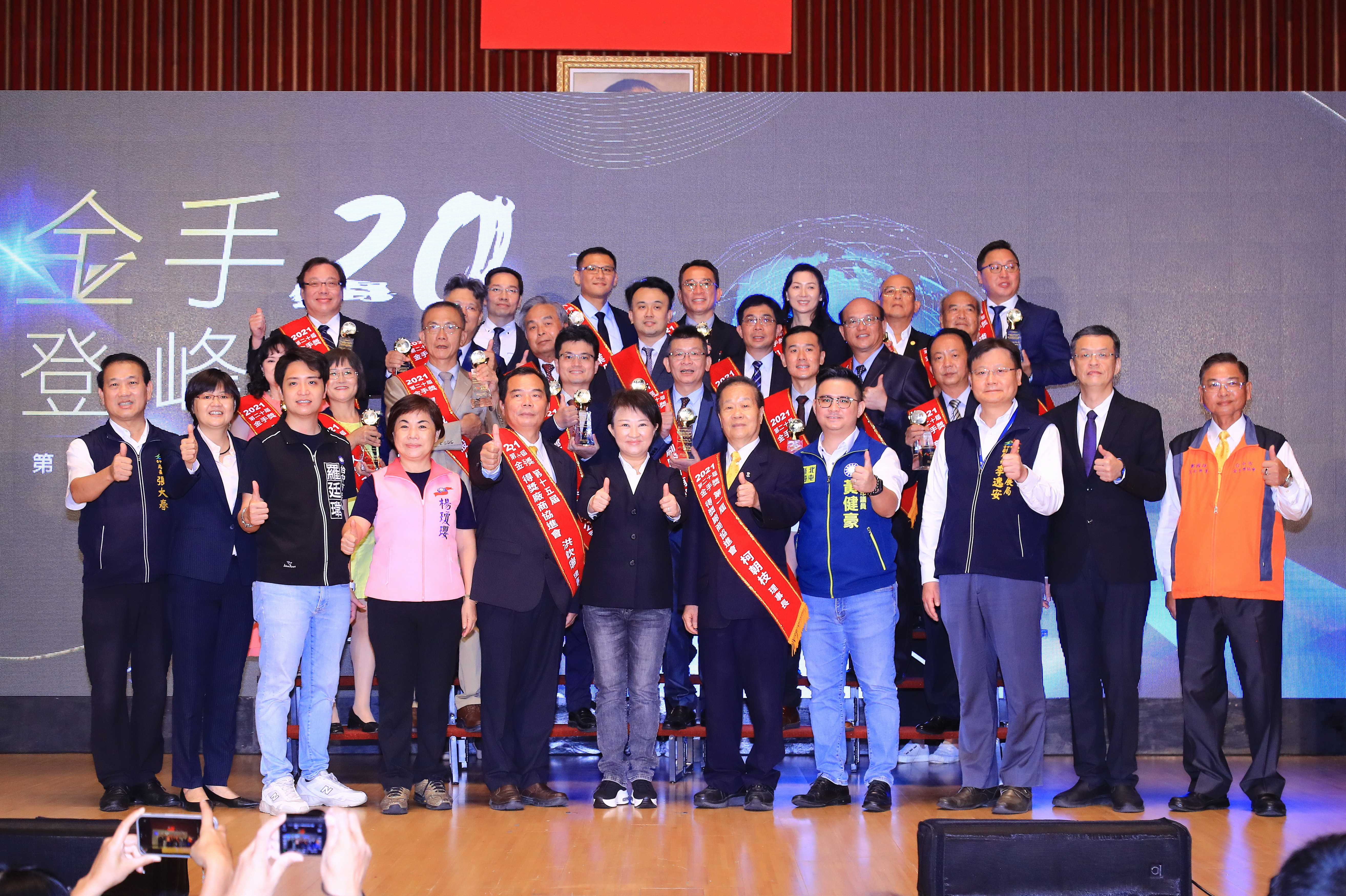 今日頒獎典禮,特別讓得獎者走一段隆重的星光大道,所有人夾道歡迎,凸顯市府的重視,得獎廠商更攜帶道具合影,肯定金手獎的榮譽;包括盧市長、台中市工商發展投資策進會總幹事黃于珊、勞工局長張大春、立委楊瓊瓔、市議員羅廷瑋、黃健豪、劉士州、經發局副局長李逸安,以及市議員黃馨慧、陳文政等服務處代表皆到場祝賀。