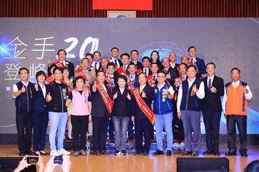 「金手20再創高峰!」台中市金手獎得獎廠商協進會理事長洪欽瑞說,金手獎創立於2002年,希望鼓勵在地企業卓越精進,提升競爭力,成為地方經濟發展火車頭,一轉眼邁入20年,在新冠疫情衝擊下,全體評審委員在防疫安全公平公正原則下評審出20家績優企業,感謝盧市長的支持。