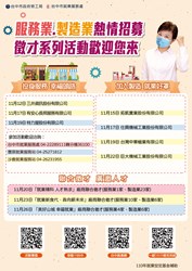 協助製造業及服務業者尋找人才,台中市政府勞工局11月份辦理「服務業.製造業 熱情招募」徵才系列活動,邀集近80家廠商,釋出超過2,600個就業機會,首場服務業三井資訊徵才今(12)日登場,陸續還有多場徵才活動,歡迎求職者踴躍參加。