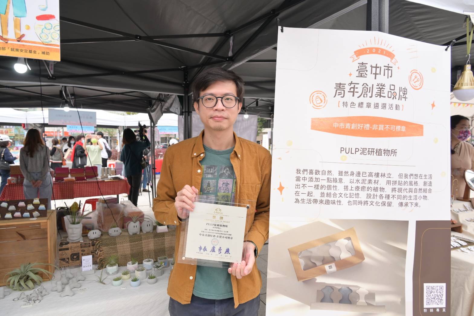 台中市政府勞工局日前舉辦「青年創業品牌特色標章遴選」及「光復新村青創基地座椅設計競賽」,審查結果出爐,共35件作品獲獎,今(13)日由勞工局長張大春代表市長盧秀燕頒發獎狀,表揚青年優異表現。