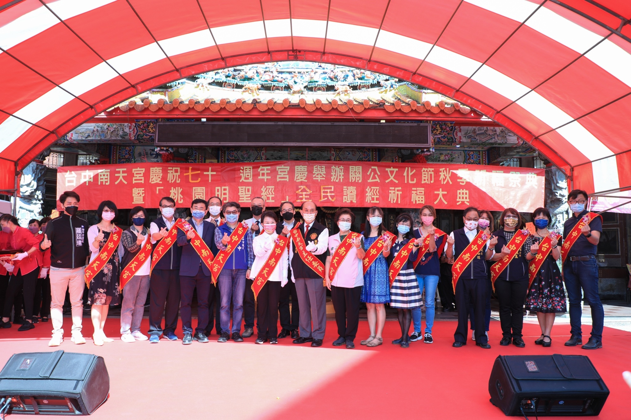 民政局表示,台中南天宮從民國41年建廟至今已有70年歷史,廟宇樓頂有尊標高146公尺的關聖帝君神像,是台中最大的聖帝君廟,也是地方重要的宗教信仰中心,香火鼎盛,多年來庇佑市民,更致力推行公益。