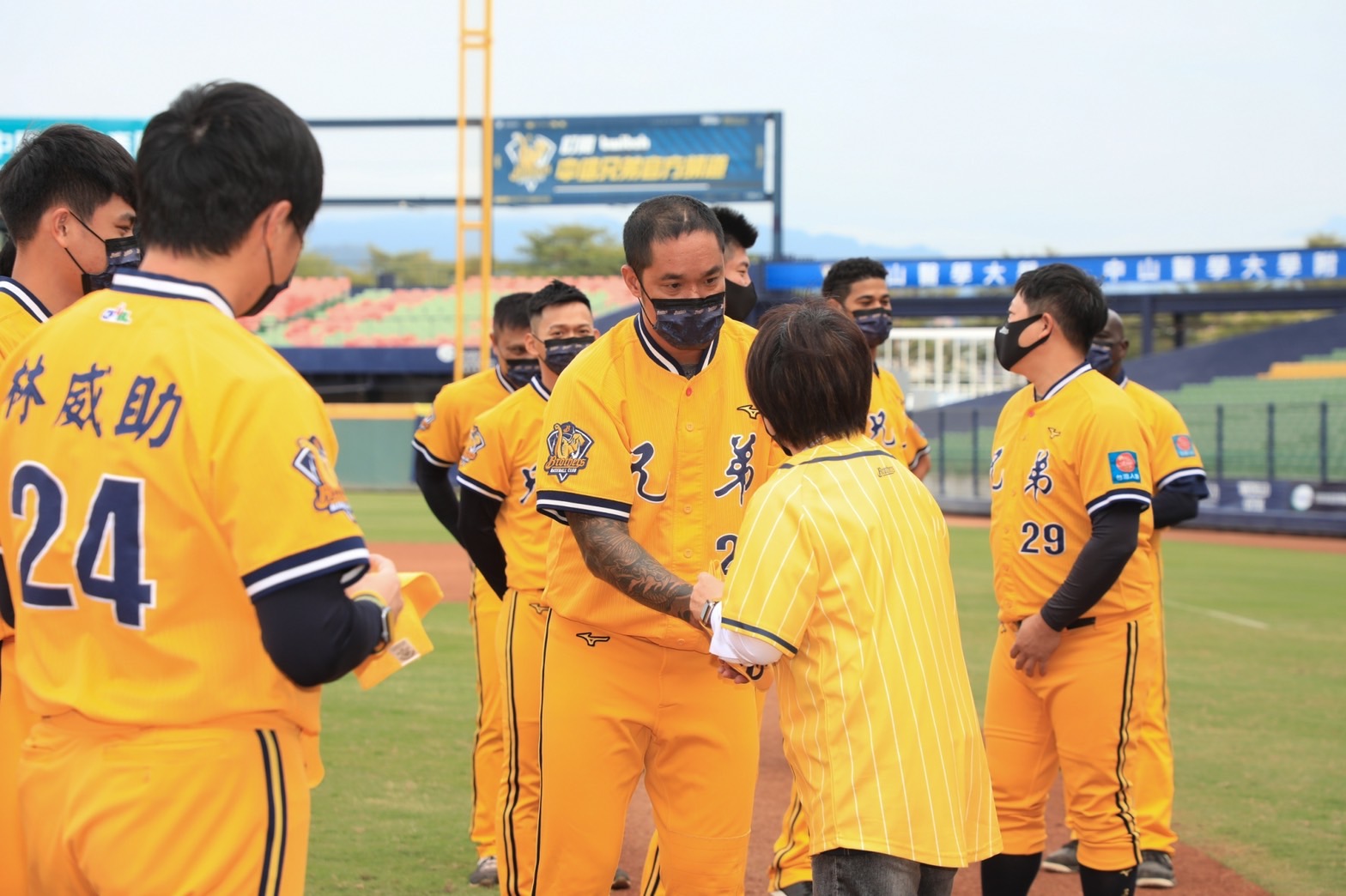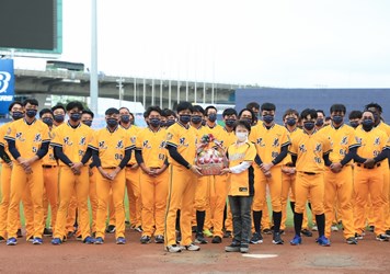 盧市長到洲際棒球場慰勞中信兄弟全體隊員,關心選手練球及目前狀態,並致贈全隊水果禮盒,球隊也回贈為球迷準備的限量加油球衣、口罩、毛巾。盧市長表示,今天中信兄弟回贈的球衣是球隊準備給專屬球迷的,今天新亮相而且主題是「Light it up」,代表疫情後全新開始,希望點亮球迷熱情,讓各個地方亮起來。
