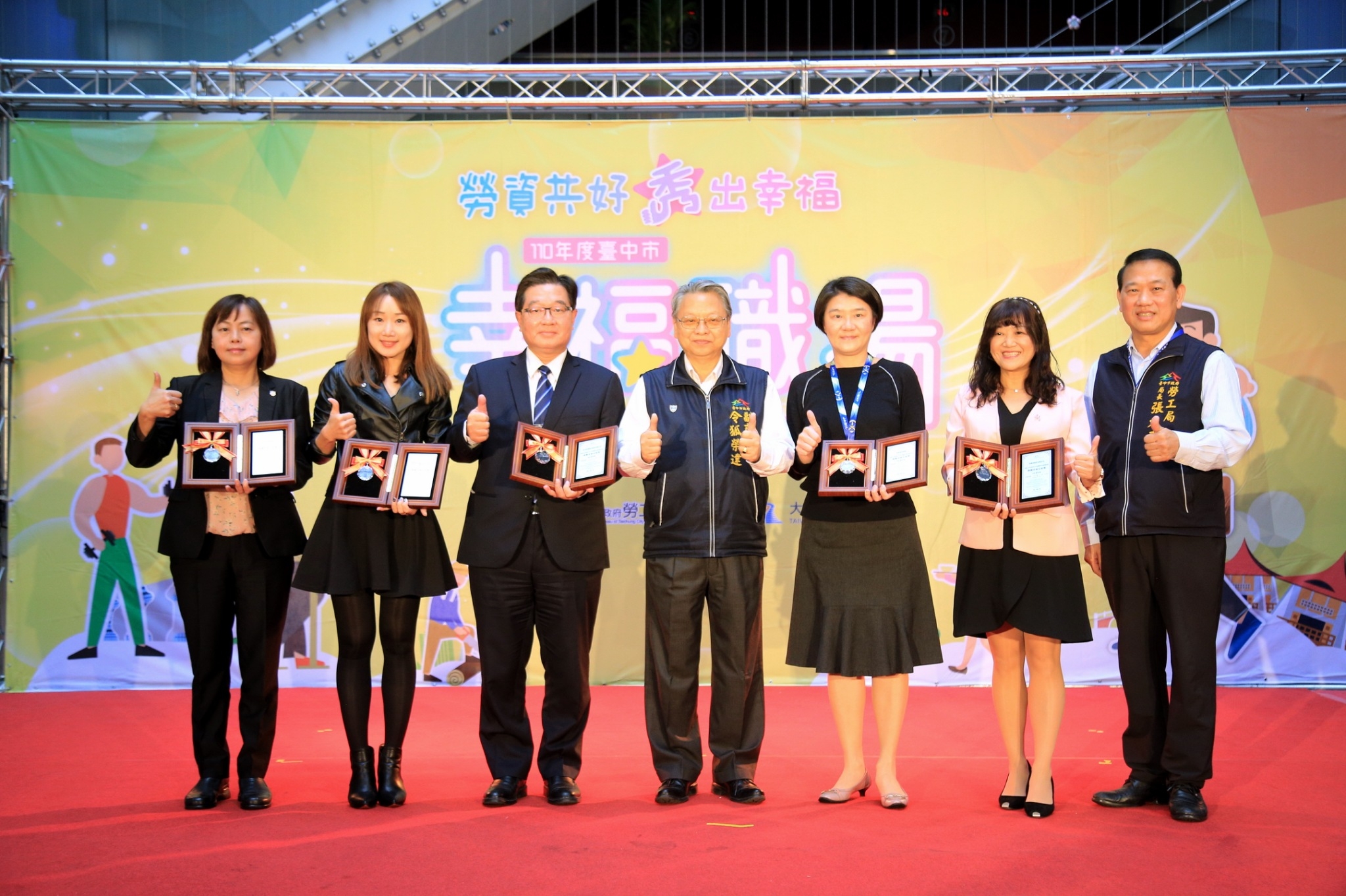 台中市政府110年度幸福職場評選結果出爐!今年共33家優良企業獲選,並由台中商業銀行股份有限公司、香港商世界健身事業有限公司台灣分公司、美商捷普集團、築間餐飲集團與和德昌股份有限公司拿下「推動幸福五星獎」,員工福利措施包括家庭日、疫苗接種假給薪、免息代償員工就學貸款、依市場物價年度調薪等。副市長令狐榮達今(25)日頒獎表揚得獎企業,期盼鼓勵更多企業打造勞資共好工作環境。