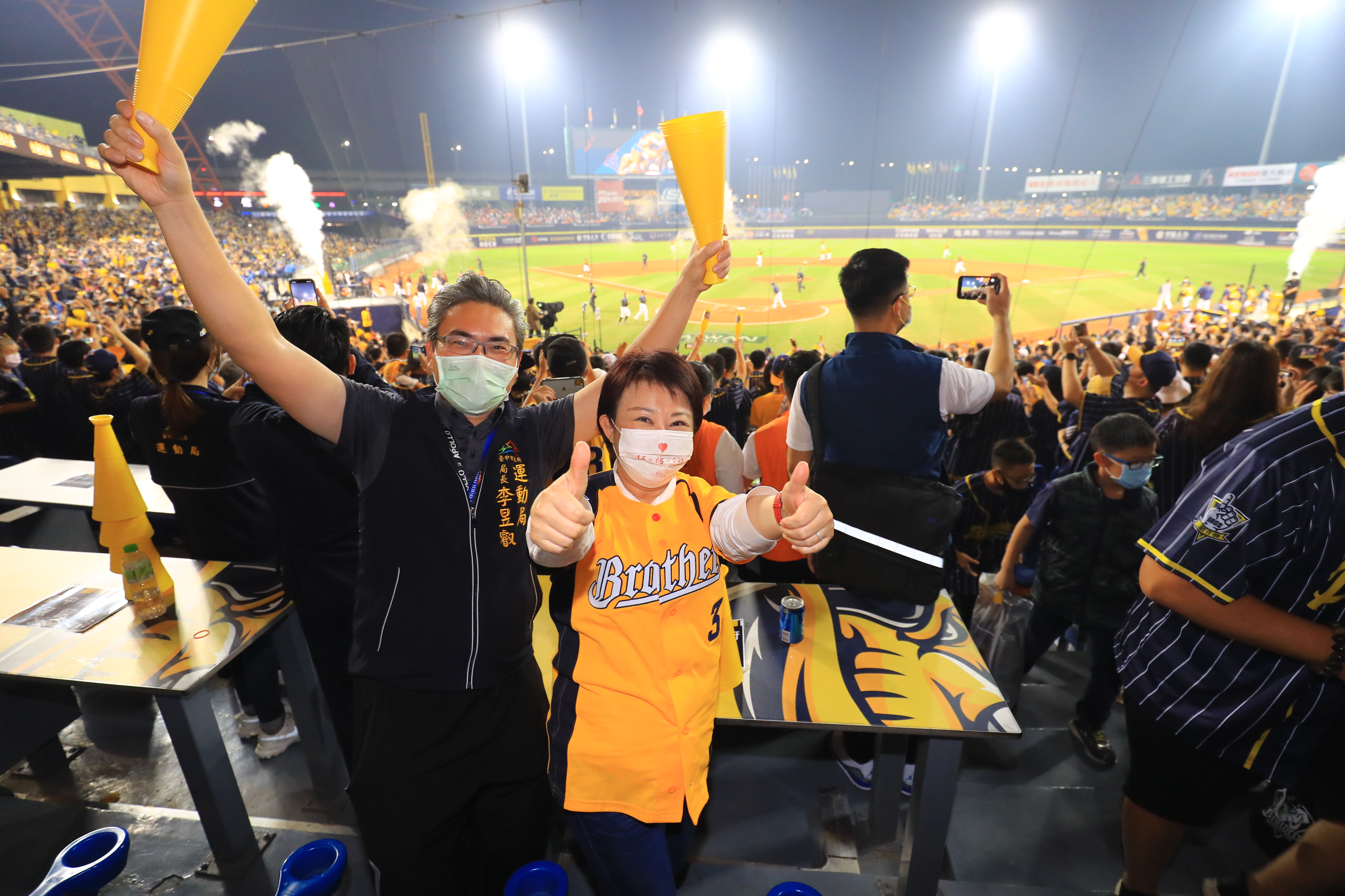盧市長今晚特別穿上中信兄弟球衣「坐整場」全程觀賽,與滿場球迷熱情揮動加油棒為選手加油,中信兄弟在1局下半由周思齊轟出全壘打,一舉拿下3分領先,盧市長忍不住站起來與全場象迷一起歡呼,雀躍的與運動局長李昱叡敲擊加油棒,現場情緒沸騰,最後中信兄弟轟出4支全壘打,以8:3拿下總冠軍賽第二勝。