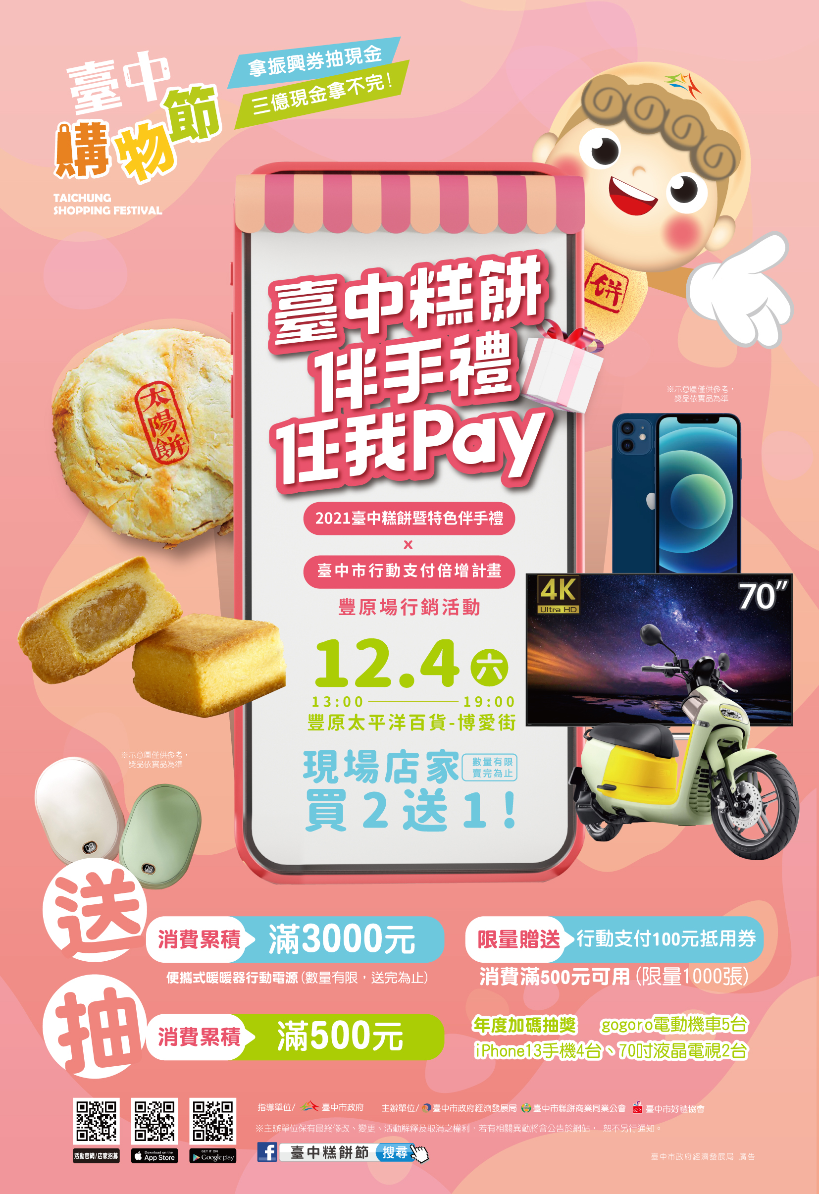 經發局補充說明,此次活動將配合「台中購物節」現場抽出10005000元現金、1210萬元及市長加碼1iPhone13得主。此外,現場消費金額登錄購物節APP還可3倍累計,參與抽現金、抽好宅。台中糕餅和特色伴手禮聞名全台,歡迎大家趁豐原場展售活動一次購足,下一個中大獎的可能就是你,活動相關訊息請至台中市政府經濟發展局網站http://www.economic.taichung.gov.tw/查詢;行動支付申辦與推廣訊息,請至台中市行動支付倍增計畫網站https://taichung.mobile-pay.org/查詢。(12/1*6)*經濟發展局