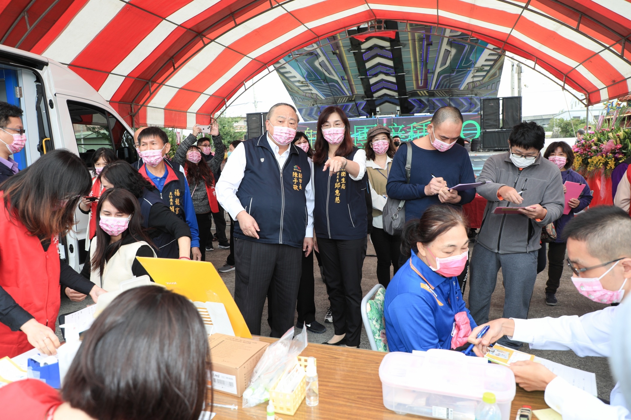 陳副市長表示,感謝磐石會集合企業力量捐款近500萬,提供市府購置行動防疫車及相關醫療設備,該車設備齊全,執行採檢時可阻絕飛沫噴濺,內設冷藏冰箱儲放疫苗,並可至各地服務,市民團體包括公司行號、社區等符合條件者,揪團30人可向衛生所登記,較偏遠醫療資源缺乏地區市府會派行動防疫車到當地服務,對未來防疫工作有很大助益,另也感謝福龍宮提供場地供民眾施打疫苗。