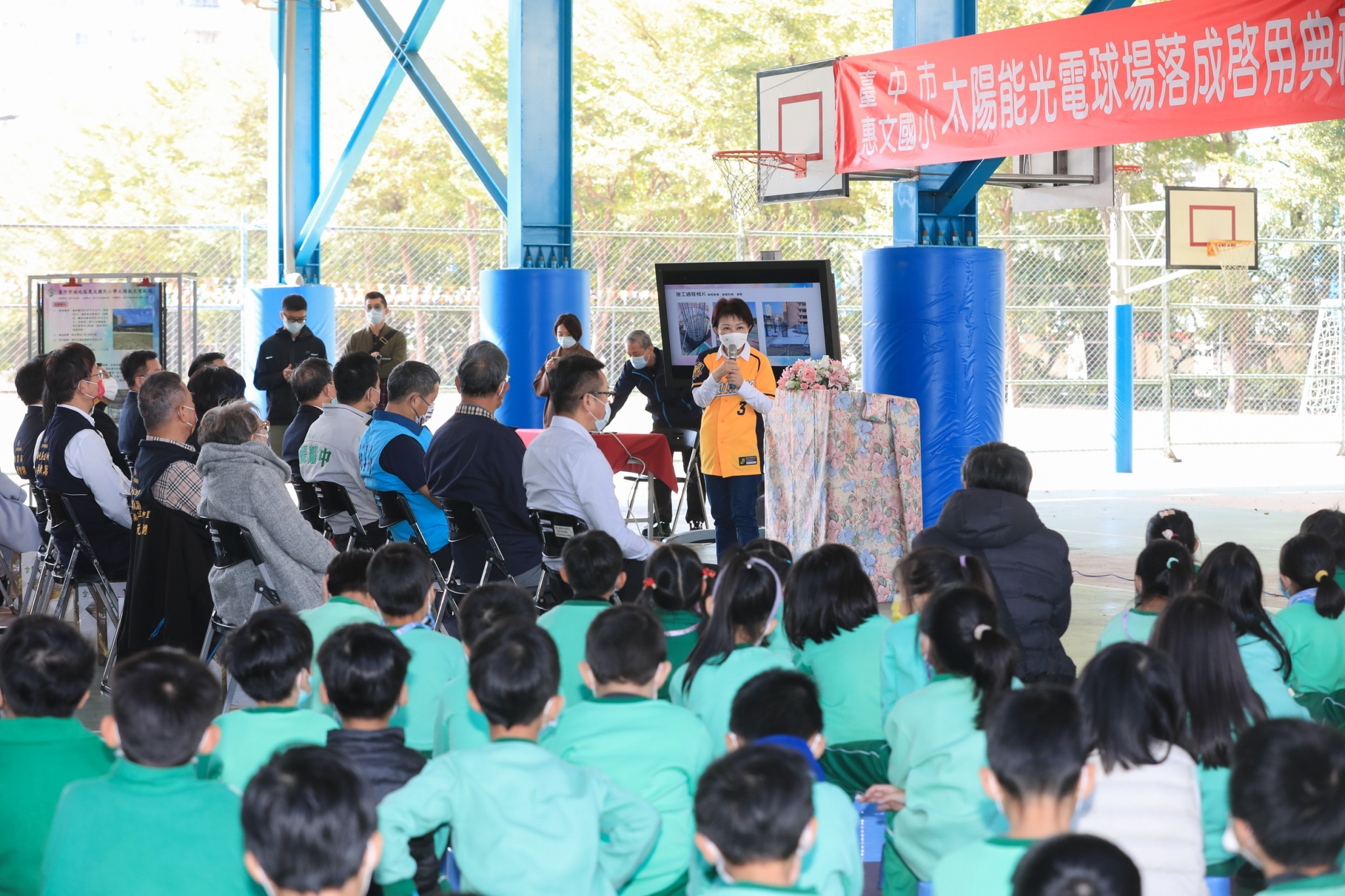 盧市長今日出席啟用典禮時表示,市府加強整治空污,也持續強化綠能發電,台中市陽光充足,可妥善運用太陽能光電,因此推動學校戶外太陽光電球場,此次計畫共30校,日前豐田國小已落成啟用,今日惠文國小是第二所,可達四大功能,包括打造遮陽避雨的球場、增加綠能發電、發電所得部分回饋學校及節能減碳,讓師生不受天候影響仍有完善優質的戶外運動空間。