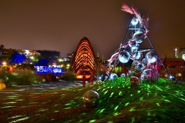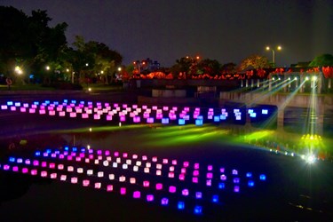 觀旅局表示,此次金色葫蘆墩布展範圍從第四區至第五區,共有8件光藝術作品,結合「聲音」呈現「聽覺」與「視覺」的沉浸感,帶給民眾全新感官體驗。第四區規劃兩座光藝術作品「織緒」及「轉念」,「織緒」以繽紛的顏色編排猶如迷宮,亮麗的色彩象徵生命中的多采多姿,也意味每條思緒創造著亮麗的未來,邀請大小朋友帶著探索樂趣穿梭其中,讓每一個入口成為未知的期待、每一個出口都是嶄新的開始;另一個作品「轉念」,以吉祥的葫蘆為意象,象徵即使經歷了時代變遷,心中仍轉動閃耀著豐原過往繁榮的感念。